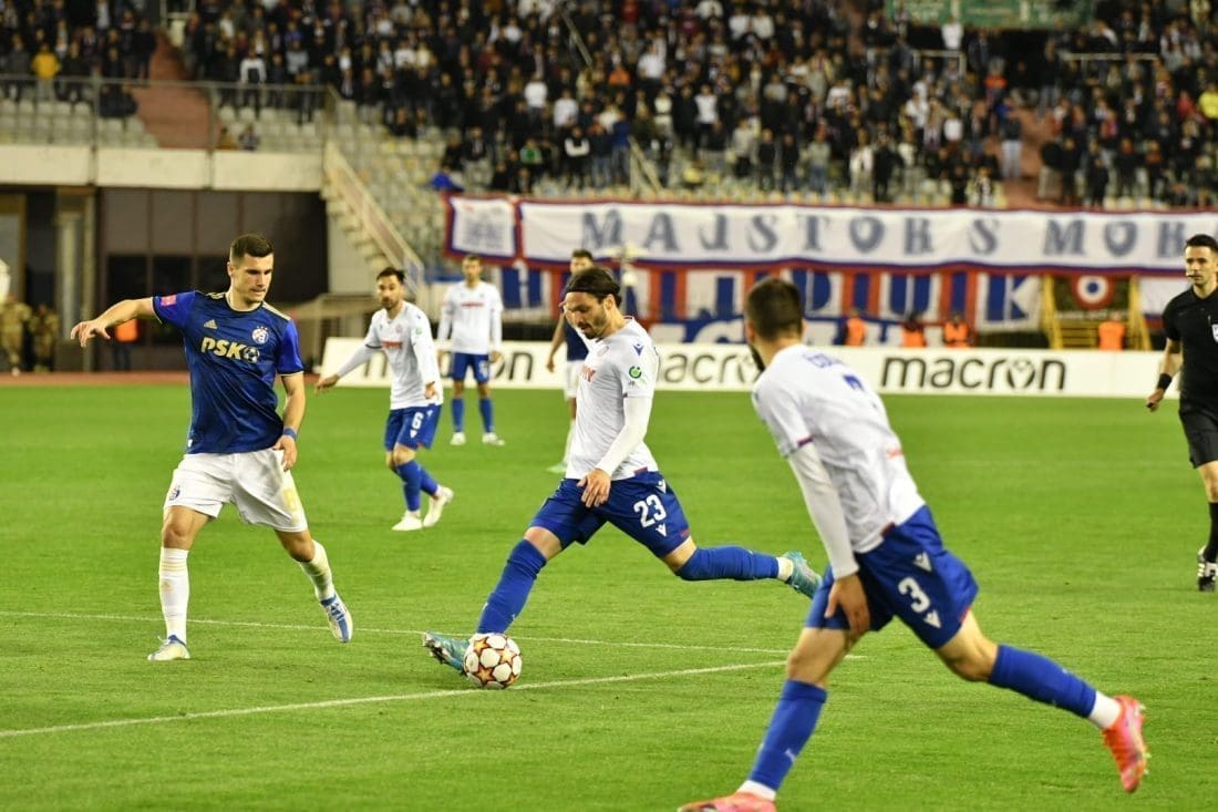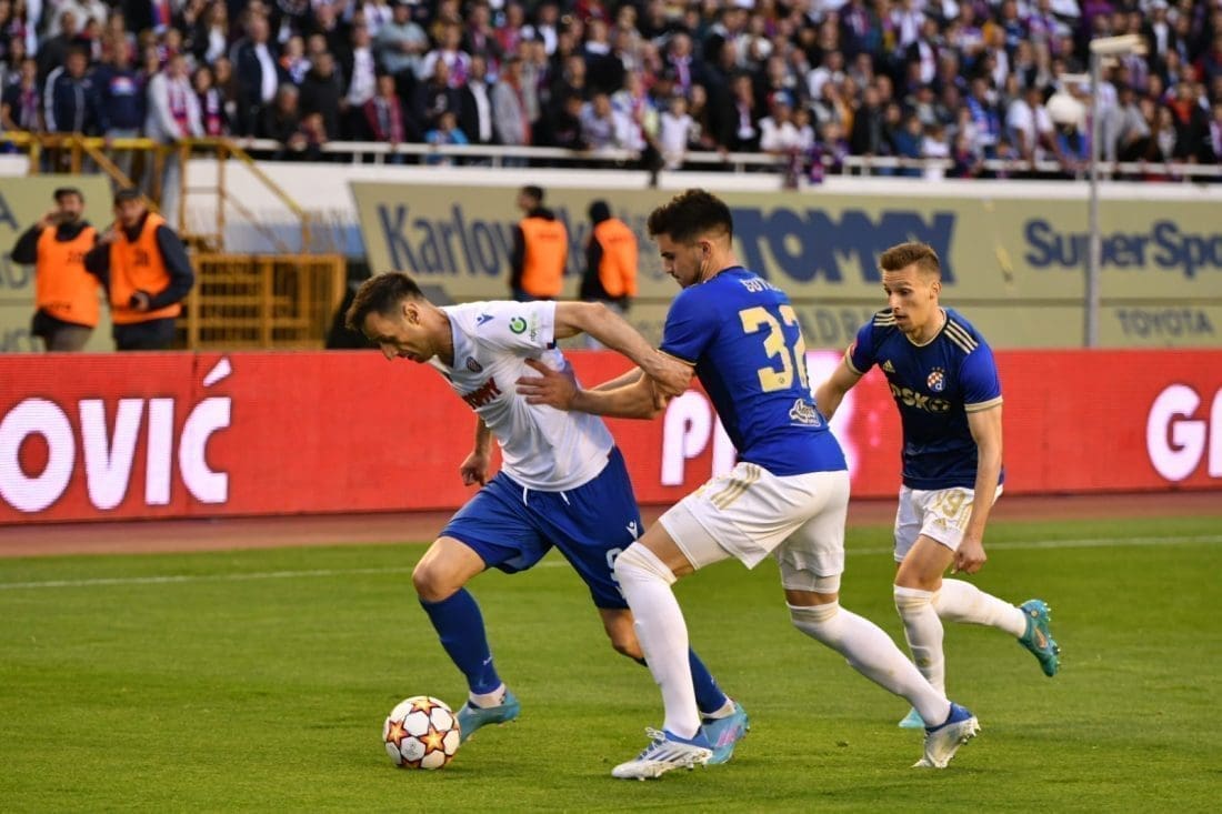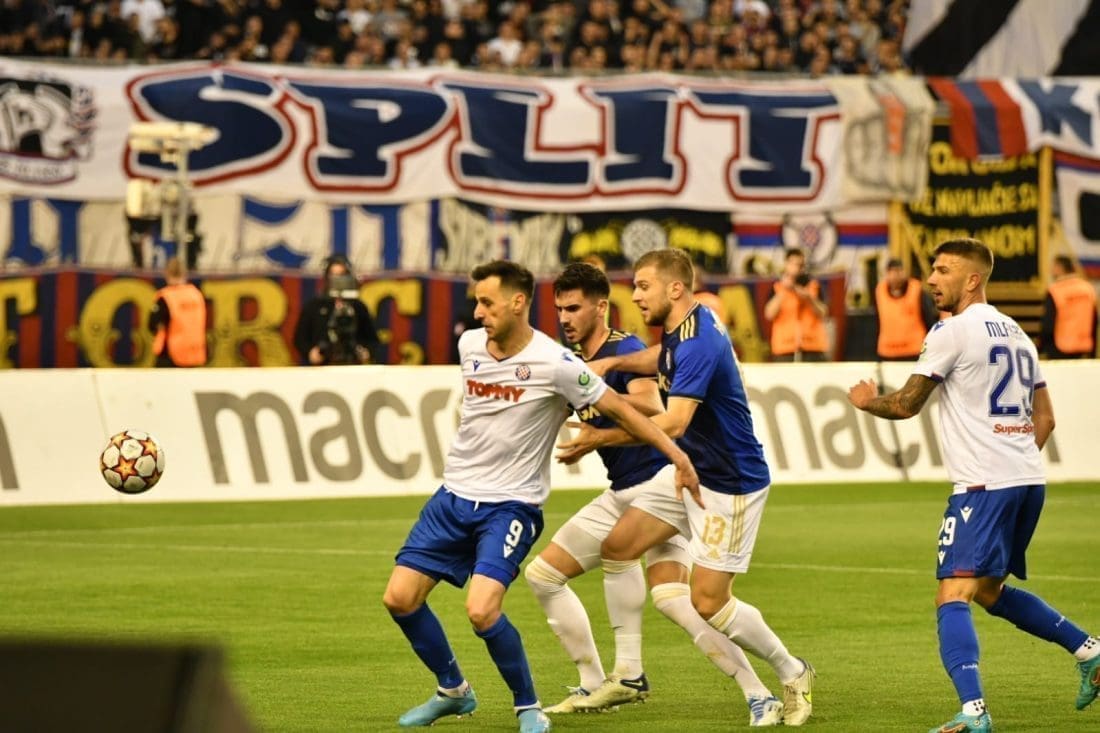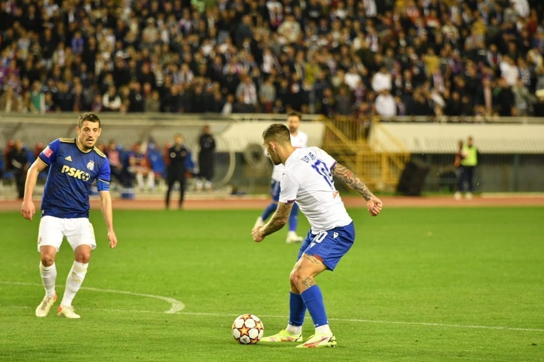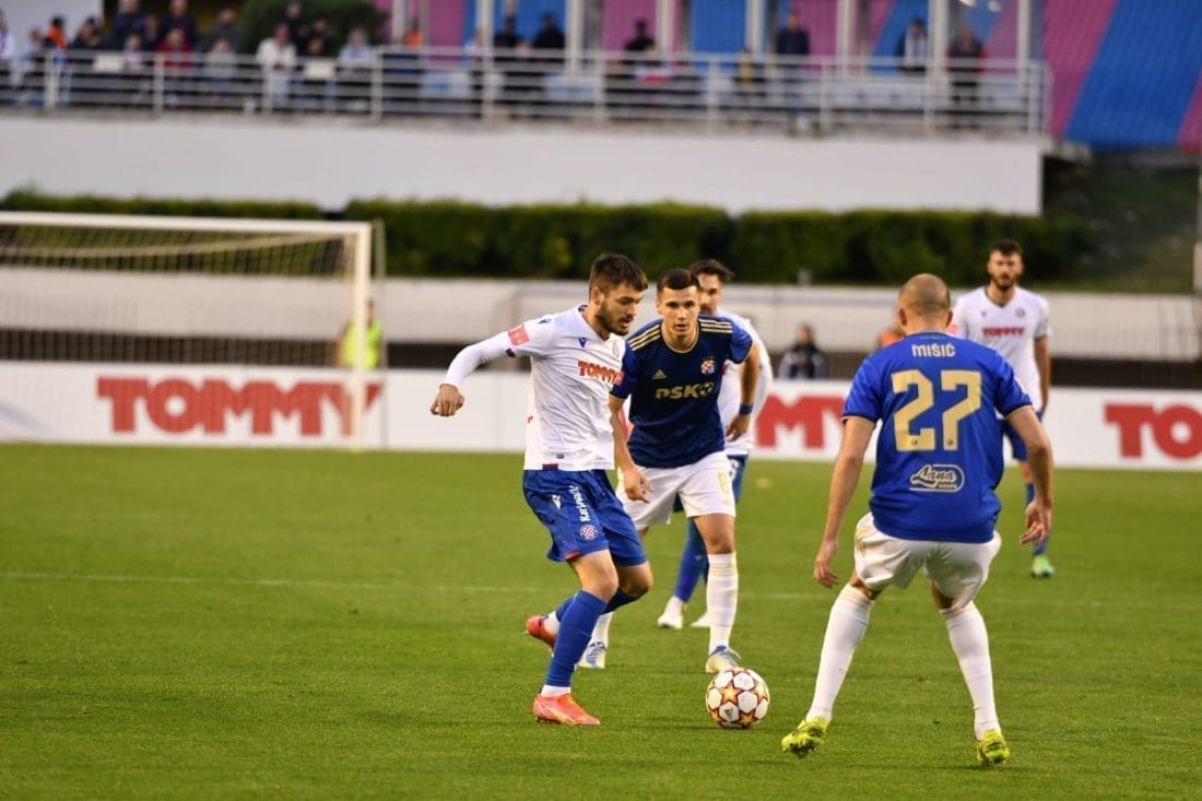 Početak utakmice obilježen je Emrelijevim padom i ležanjem. Kalinić je u 10. minuti izborio prekid u odličnoj poziciji, na 18 metara iskosa, ali Krovinovićev je pokušaj zapeo u bloku. Ristovski je odmjereno ubacio s desne strane u 12. minuti, ali Mikanović se dobro postavio u skoku. Kalinić je u 13. minuti zamalo iznenadio vratara Livakovića uklizavši mu na povratnu loptu pa je Dinamov čuvar mreže morao panično izbacivati. Nakon kornera u 15. minuti Livaković je ipak prvi došao do lopte. Hajdukovci su u 20. minuti signalizirali igranje rukom Ristovskog, sudac Pajač nije se oglasio.