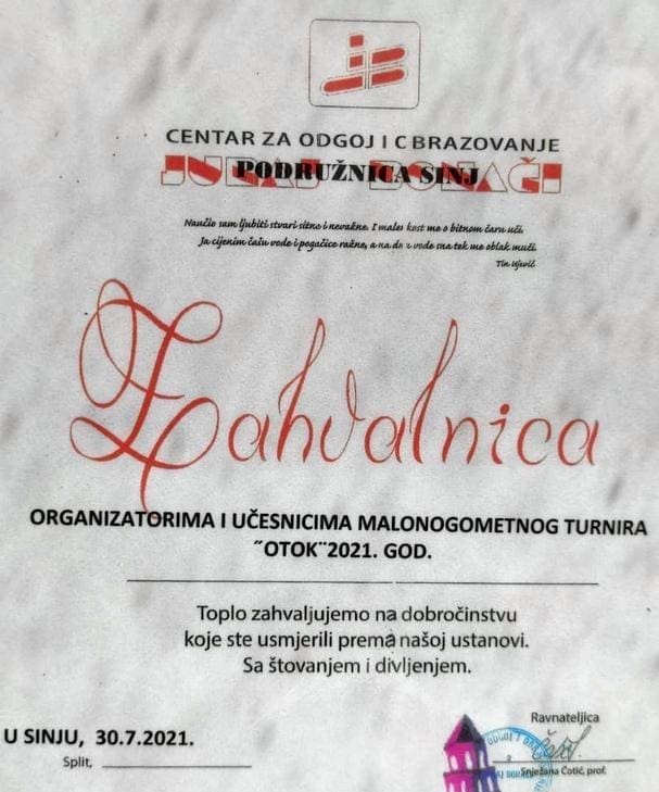 Na humanitarnom turniru odigranom u Otoku prije tjedan dana prikupljeno je ukupno 54.784,50 kuna koje su uplaćene podružnici u Sinju Centra za odgoj i obrazovanje „Juraj Bonači“ (34.784,50 kuna) i za liječenje Paola Kekezovića (20.000 kuna).