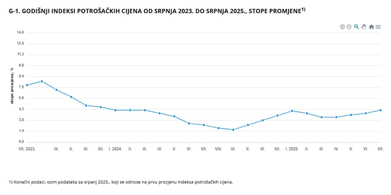 Prema prvoj procjeni Državnog zavoda za statistiku, cijene dobara i usluga za osobnu potrošnju u Hrvatskoj u srpnju 2025. porasle su za 4,1% u odnosu na isti mjesec prošle godine, dok su u odnosu na lipanj porasle za 0,4%. Riječ je o nastavku trenda rasta cijena koji Hrvatsku i dalje drži u gornjoj polovini ljestvice najviših stopa inflacije u eurozoni.