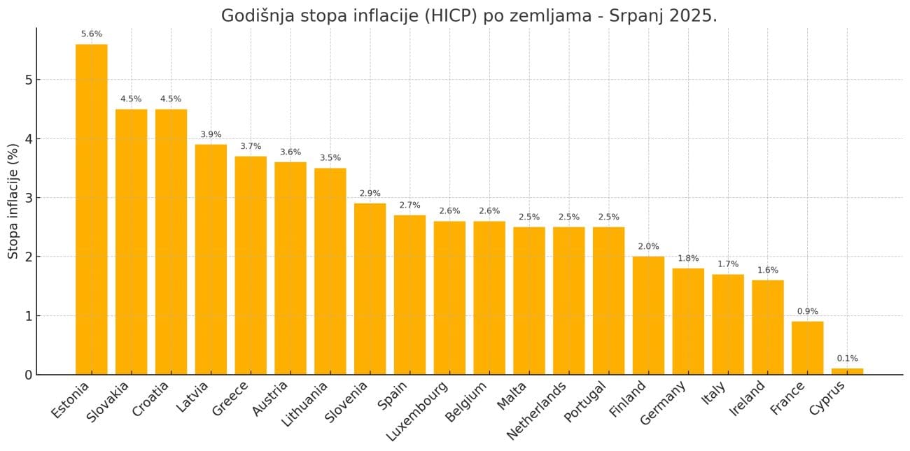 Prema podacima Eurostata, inflacija u Hrvatskoj od 4,5% znatno je viša od prosjeka europodručja, a višu godišnju stopu ima tek Estonija (5,6%). Slovačka je na 4,5%, Austrija na 3,6%... Njemačka je u srpnju zabilježila inflaciju od 1,8%, Francuska tek 0,9%, a Italija 1,7%, dok je prosjek eurozone ostao na stabilnih 2,0%.