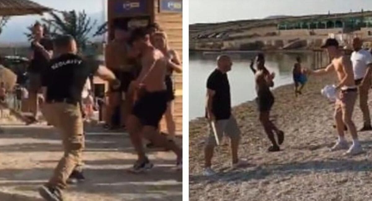 Posjetitelji su počeli bacati predmete na izbacivače, a oni su odmah reagirali. Počeli su ih udarati palicama i tuči ih, a na snimci koja je objavljena na Twitteru vidi se kako jedan od muškaraca bježi u more kako bi se spasio, prenosi Večernji list.