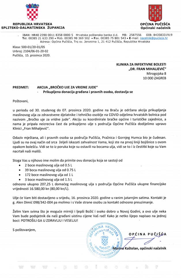 - Pripala nam je čast da 207.25 litara maslinovog ulja prikupljenog na području Općine Pučišća bude dodijeljeno upravo ovoj bolnici o kojoj toliko čujemo u zadnjim mjesecima. Potrošili ga u zdravlju i veselju! Hvala našem neumornom Alenu Dimiću - poručio je načelnik Marino Kaštelan.