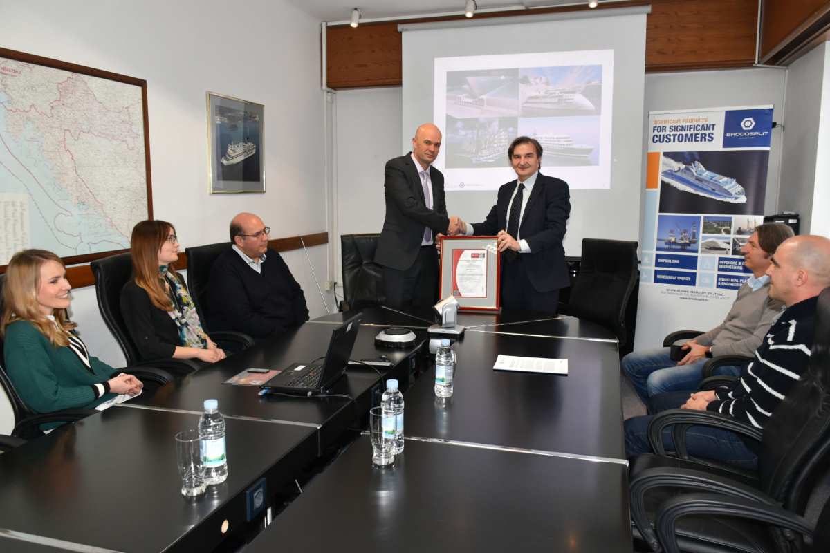 Predstavnik certifikacijske kuće Bureau Veritas Željko Pehar uručio je certifikat Zoranu Kunkeri, izvršnom direktoru i članu Uprave Brodosplita, uz čestitke za dobro obavljen posao izgradnje i primjene novog sustava.