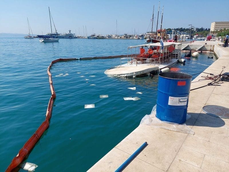 Sama benzinska postaja opasana je policijskim trakama koje zabranjuju pristup s obalne strane, a Morska vila sa branama protiv širenje onečišćenja. No, miris nafte dobro se "čuje". Na površini plutaju nekakve krpe, maramice za upijanje nafte.
