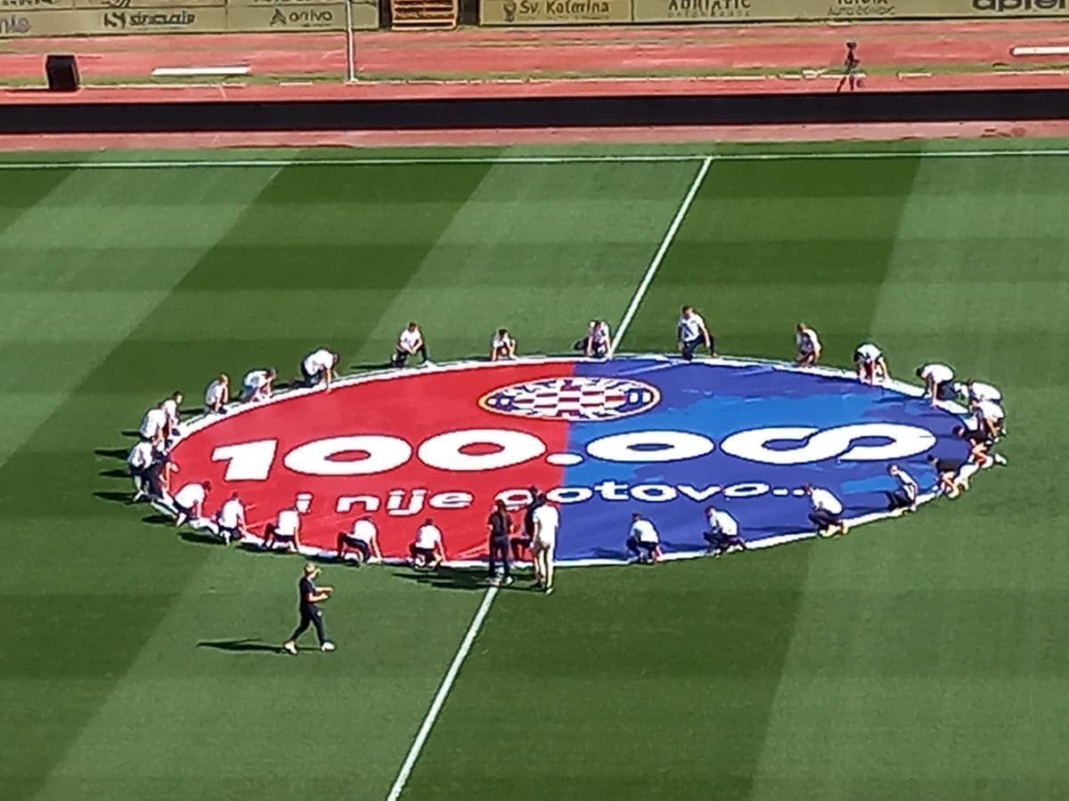 Kako doznajemo, nekoliko sati prije utakmice na centru poljudskog terena 'osvanula' je velika zastava u čast 100 000 članova Hajduka.