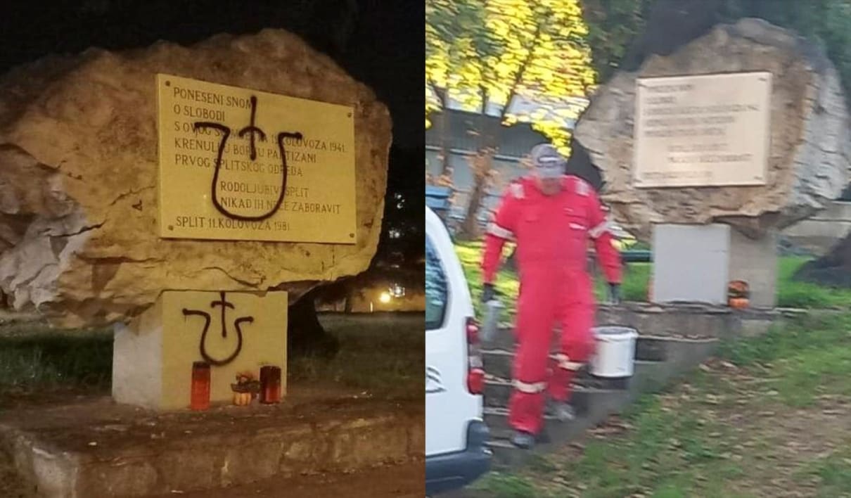 Spomen-ploča posvećena Prvom splitskom partizanskom odredu na Plokitama ponovno je bila meta vandala. U noći sa subote na nedjelju nepoznate osobe iscrtale su crnim sprejem dva ustaška „U“ znaka presječena križevima, što predstavlja još jedan u nizu napada na ovo obilježje antifašističke borbe.