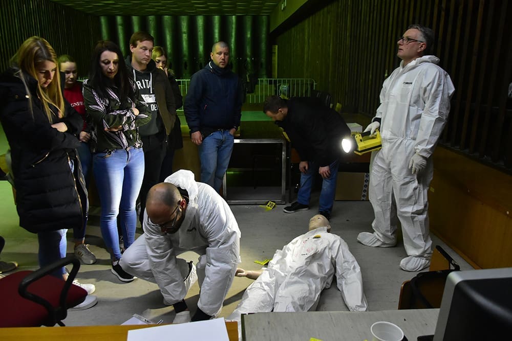 Naime, temeljem dugogodišnje suradnje Sveučilišnoga odjela za forenzične znanosti Sveučilišta u Splitu i Policijske uprave Splitsko-dalmatinske (PU SD) održana je zajednička vježba studenata i djelatnika Forenzike s iskusnim stručnjacima Odjela kriminalističke tehnike PU SD. Studenti su pod stručnim vodstvom iskusnih policijskih istražitelja i kriminalističkih tehničara u prostorima PU SD sudjelovali u istraživanju mjesta događaja osmišljenog za potrebu vježbe te su samostalno tražili, označavali, dokumentirali i tumačili tragove i okolnosti događaja, a sve pod budnim okom policijskog istražitelja za očevide Denisa Fiamenga, mag. kem. ing., višeg kriminalističkog tehničara Vinka Milića, i Joška Stolice iz PU SD te asistenta s Forenzike dr. sc. Ivana Jerkovića, Ane Banovac, mag. forens., Marka Pilića, mag. forens. i Tonija Ljubića, mag. forens.