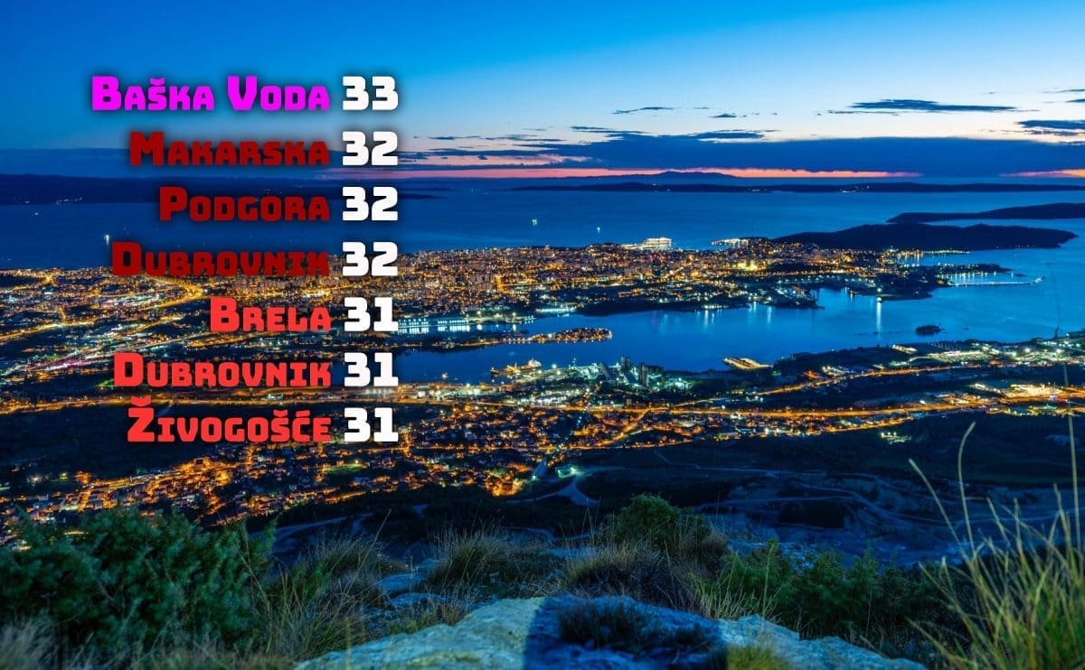 Bura i večeras ima fenski učinak. Tako su temperature zraka uz obalu sredinom noći od 27 do 32°C, a u Dalmatinskoj zagori je ugodnije s temperaturama od 21 do 26°C. U sjevernoj i srednjoj Dalmaciji je barem malo svježije u odnosu na vrijednosti prije 24 sata, no toplije je od Makarske prema jugu. Čak 10 stupnjeva toplije nego jučer u ponoć je u Grudi u Konavlima s 31°C.