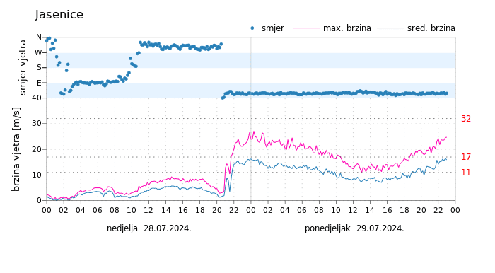 Još prošle noći uz obalu je zapuhala fenska bura koja je noćne temperature održavala vrlo visokima, a danju je bura prestala i na moru popodne okretala na tramontanu. Navečer je ponovno ojačala bura te je jača u odnosu na sinoć. Bura je najjača podno Velebita gdje mjestimice najjači udari graniče s orkanskim. I Dalmaciji je bura kudikamo slabija, ali ima jake do olujne udare. Primjerice, u Dubrovniku do 69, a Splitu 65 km/h.