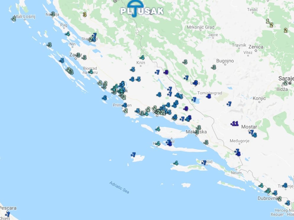 Osjetno je hladnije nego jučer pa su u 12 sati temperature zraka diljem Dalmacije od 17 do 22°C. Posvuda je zahladilo od 3 do 8 stupnjeva. Najhladnije je na Dinari sa samo 5 stupnjeva.