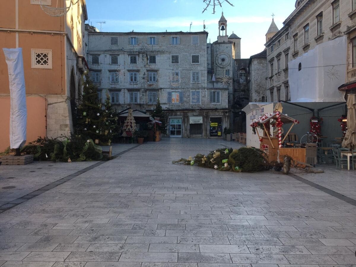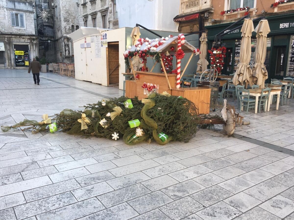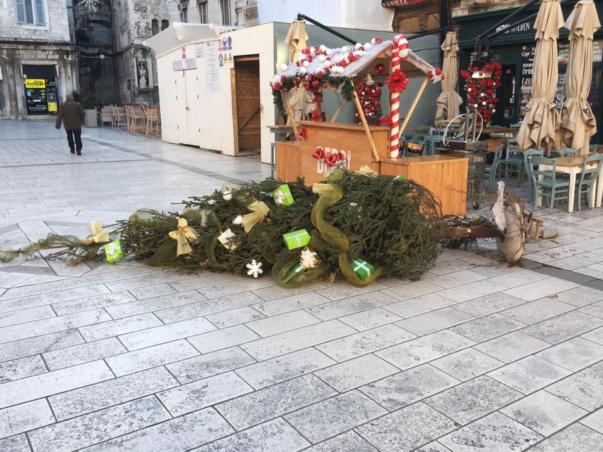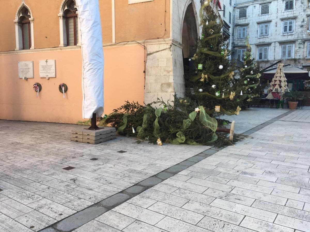 Čini se kako je prva jača bura ovog Adventa uspjela pomrsiti planove borovima na splitskoj Pjaci. Za radost naših najmlađih možemo reći da je nesretne borove slučajno gurnuo Djed Božićnjak dok je ostavljao darove ili da su ga upravo darovi "pritegli" da jutro dočeka na podu.