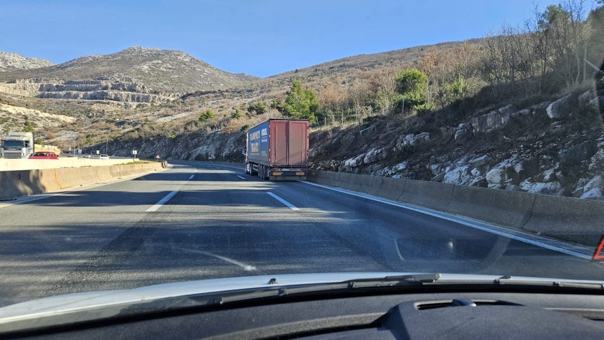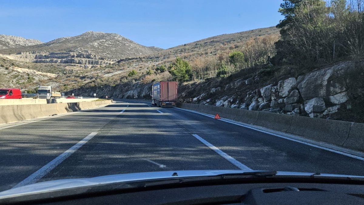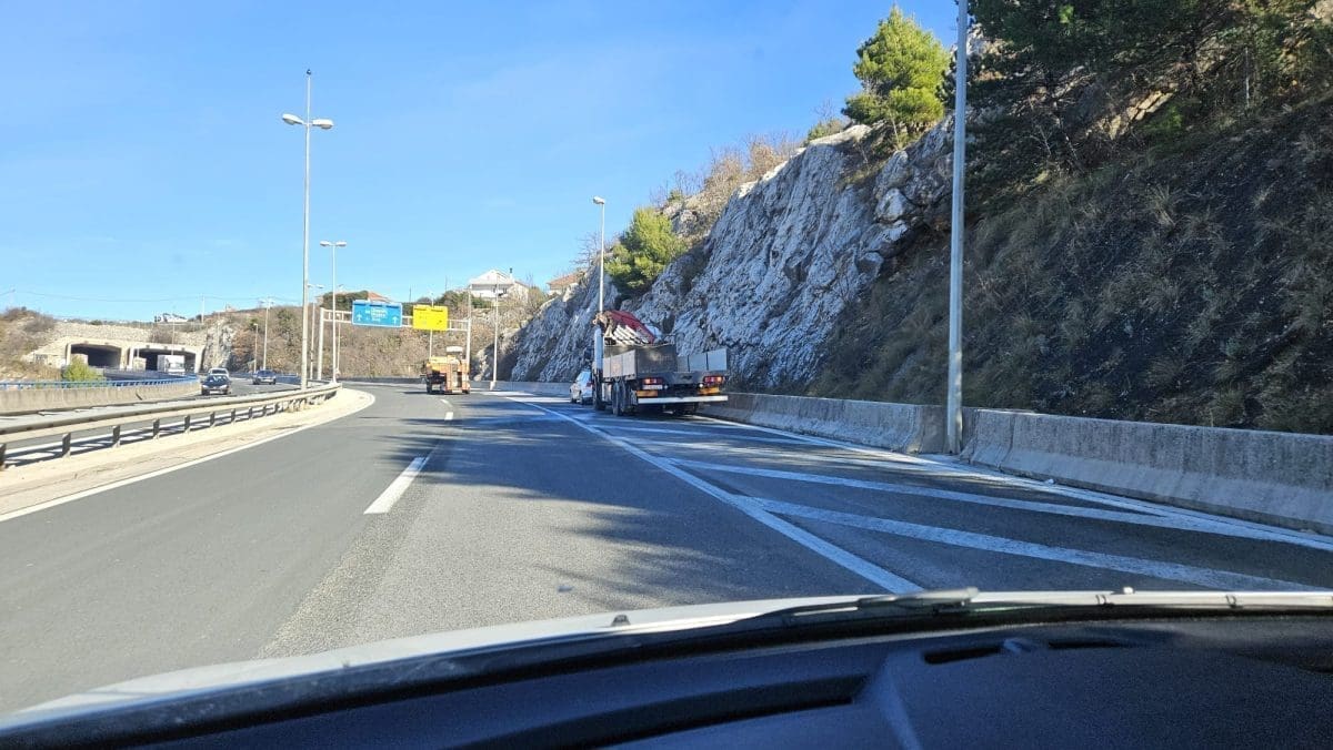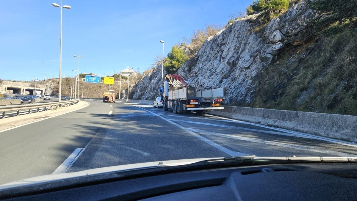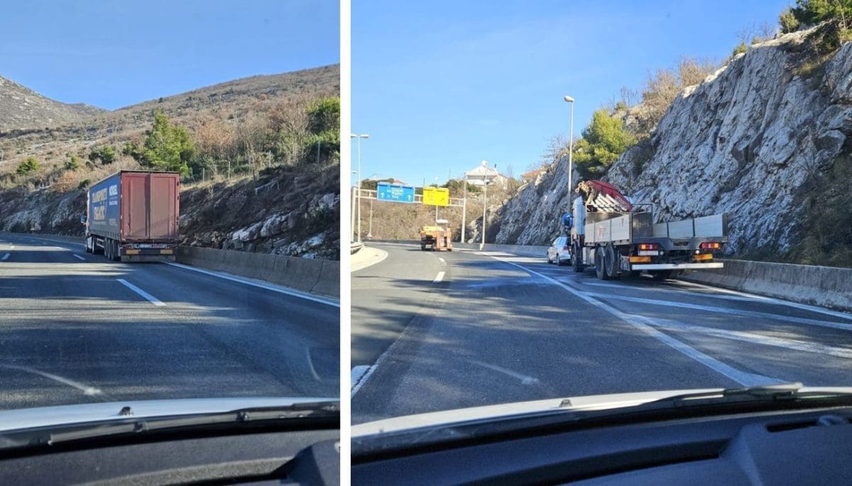 Na brzoj cesti Solin-Klis jedan čitatelj je prolaskom zapazio čak dva teretna kamiona zaustavljena u krajnje desnoj traci.