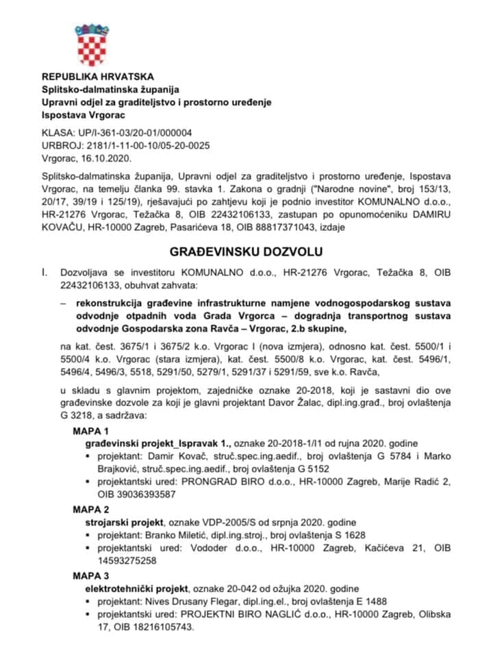 Nakon tri godine studija, izmjena prostornog plana, studija utjecaja na okoliš, projektiranja i suradnje s javno pravnim tijelima, tijekom srijede je ishođena građevinska dozvola za spajanje sustava odvodnje otpadnih voda Gospodarske zone Ravča sa sustavom grada Vrgorca.