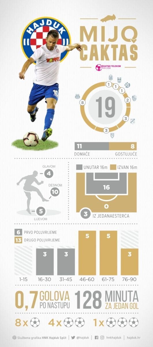 Vezni igrač Hajduka Mijo Caktaš pogotkom u derbiju protiv Dinama postao najbolji je strijelac HT Prve lige za natjecateljsku sezonu 2018/2019. Mijo je ove sezone postigao ukupno 19 prvenstvenih pogodaka, jedan više od prvog pratitelja Mirka Marića, a Bijeli su treći put otkako je samostalne Hrvatske dobili najboljeg strijelca lige. Prije njega to su uspjeli - Ardian Kozniku (1992.) te Marko Futacs (2016/17.)