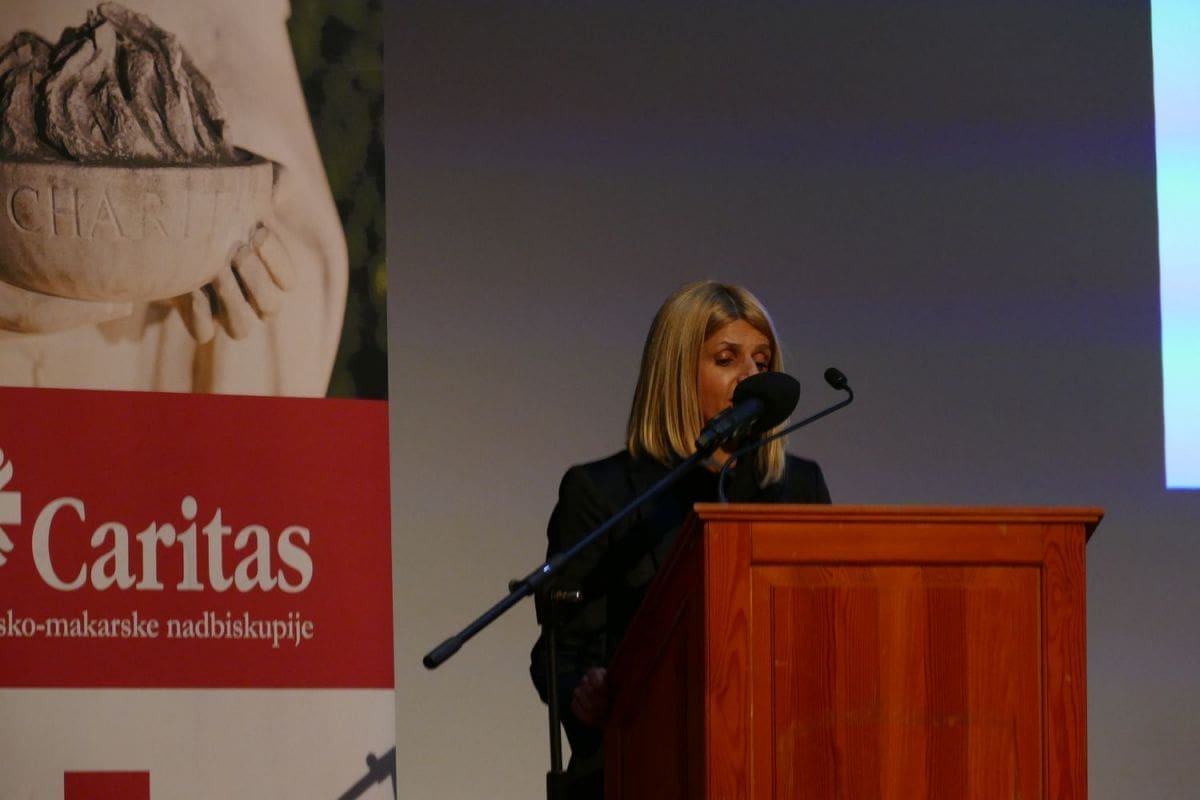 Uime grada Splita riječ pozdrava uputila je Nađa Mladinić, predstavnica Odjela za soc. skrb, zdravstvenu zaštitu i demografiju grada Splita. Kazala je da već dugi niz godina grad Split surađuje s Caritasom SMN u rješavanju problema siromaštva, zbrinjavanja djece i žena, žrtava obiteljskog nasilja te u drugim Caritasovim projektima. Uime grada zahvalila je Caritasu za sve što rade za građane Splita, što su njihova produžena ruka u skrbi za najpotrebnije naglasivši da je ruka suradnje pružena i za neke nove projekte u tom vidu.
