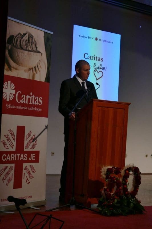Nakon misnoga slavlja upriličen je prigodni program u velikoj sjemenišnoj dvorani. Prvi se pozdravnim govorom obratio nadbiskup Barišić koji je ujedno i predsjednik Caritasa Splitsko-makarske nadbiskupije. Pozdravio je sve dosadašnje ravnatelje Caritasa od Vinke Luković, don Marka Ćubelića, Slavka Jerončića, s. Vlatke Topalović i današnjeg ravnatelja Denisa Maslova. Zahvalio je i svim suradnicima i djelatnicima koji su kroz 50 godina institucionalnog ustroja Caritasa kakvog danas imamo pomagali Caritasu. Podsjetio je kako je Crkva od svojih početaka karitativno djelovala, lokalno i međunarodno.