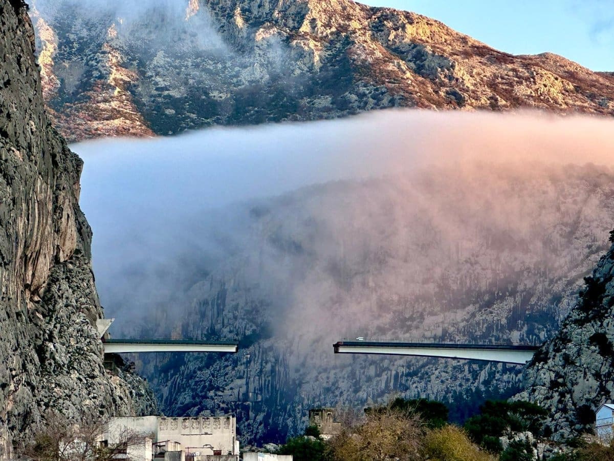 Iznad grada Omiša, poviše kanjona rijeke Cetine, u tijeku je izgradnja mosta koji je dio omiške zaobilaznice. Podsjetimo kako je riječ o projektu vrijednom 180 milijuna kuna, a do proljeća sljedeće godine bit će završena ta dionica duga 3,5 kilometra. Predviđeno spajanje mosta je u siječnju 2023.
