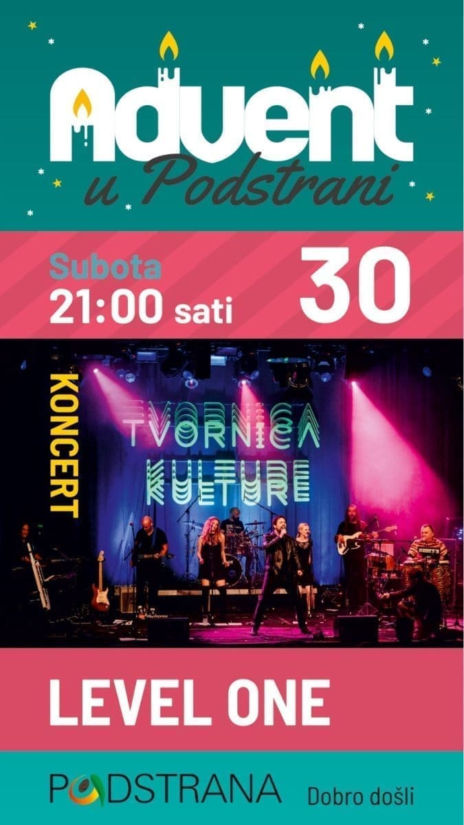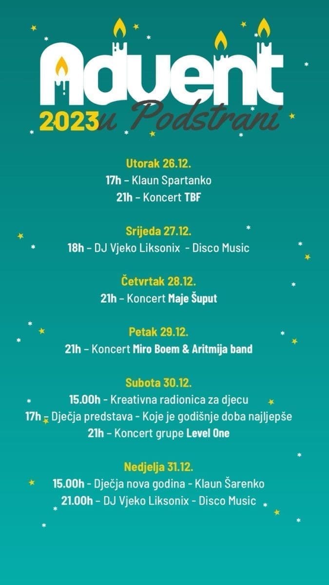 U subotu 30. prosinca u 15h na programu je kreativna radionica za djecu, a u 17h dječja predstava „Koje je godišnje doba najljepše“. Večer završava koncertom grupe Level one u 21h.