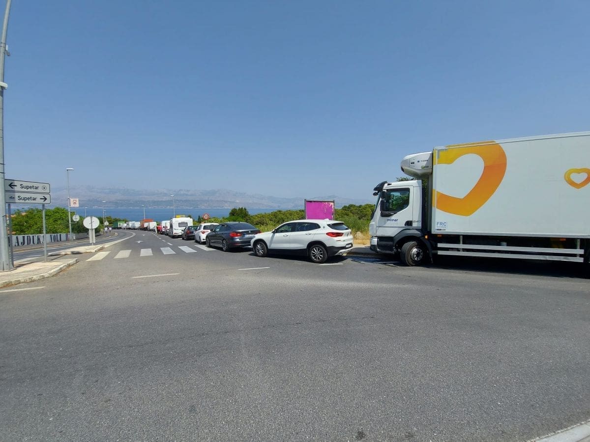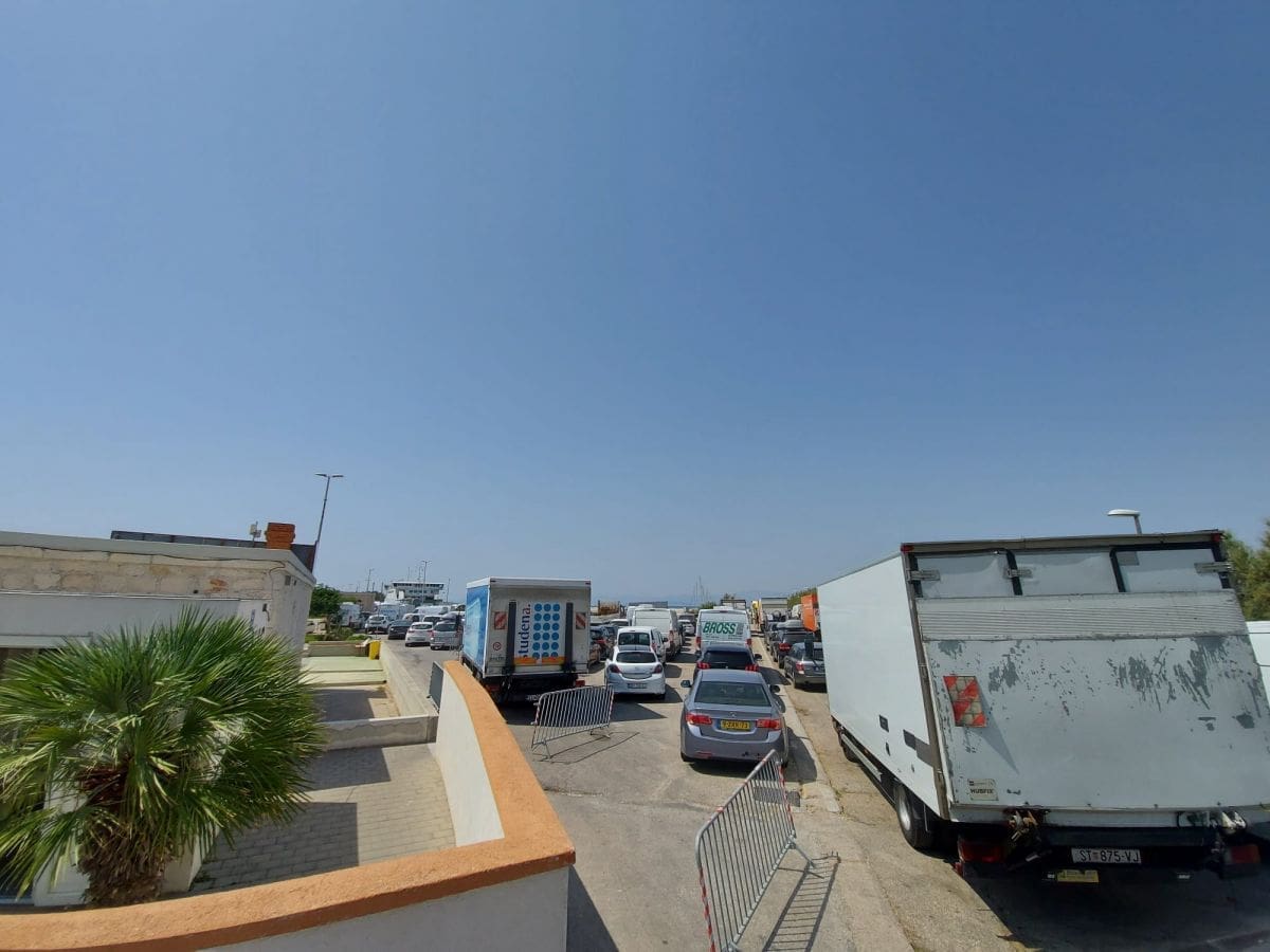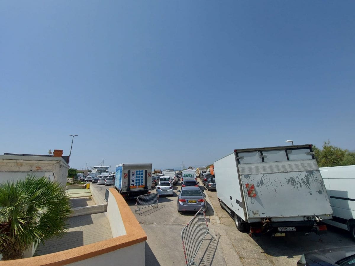 Ogromna je gužva u supetarskoj trajektnoj luci. Čeka se u kolonama, a velik broj automobila nije se uspio ukrcati na trajekt koji je kretao u 13.30.