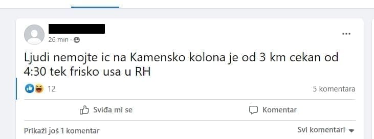 "Ljudi, nemojte ić na Kamensko. Kolona je duga 3 kilometra. Čekam od 16:30, a tek friško ušao u RH", dojavio je jedan vozač putem Facebook stranice Policija zaustavlja Split i okolica.