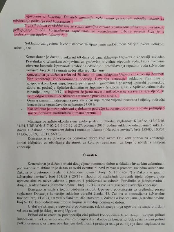Vijećnici smatraju kako Ugovor koji regulira korištenje pomorskog dobra ne može biti tajan, tim više što smo se proteklih godina na području koncesije susreli s nelegalnom gradnjom, neredovitim plaćanjem koncesije te raznim drugim problemima kojima se dovodi u pitanje očuvanje ovog područja Marjana, legalnost svih radnji. S pravom se otvara sumnja u transparentnost dodjele koncesija.