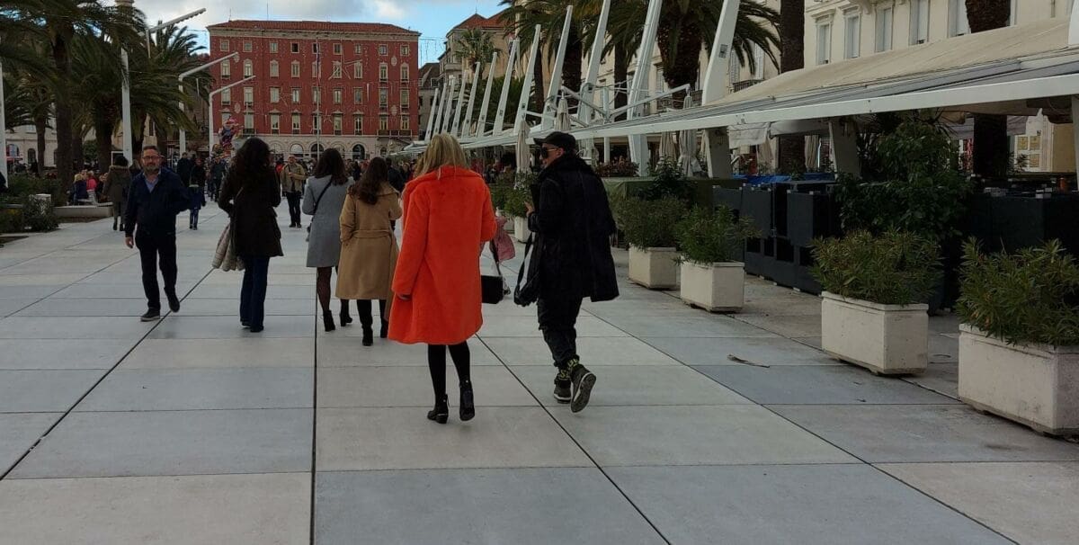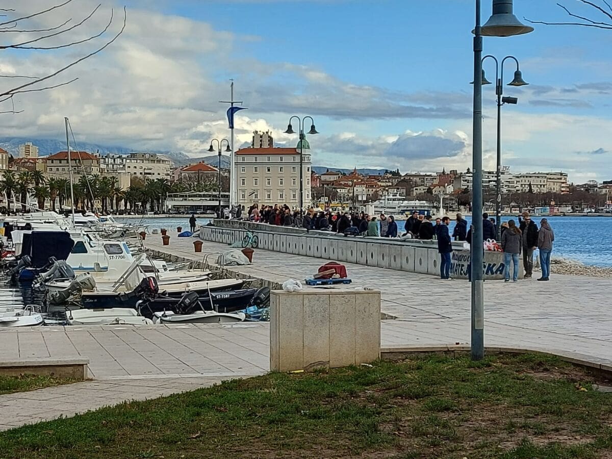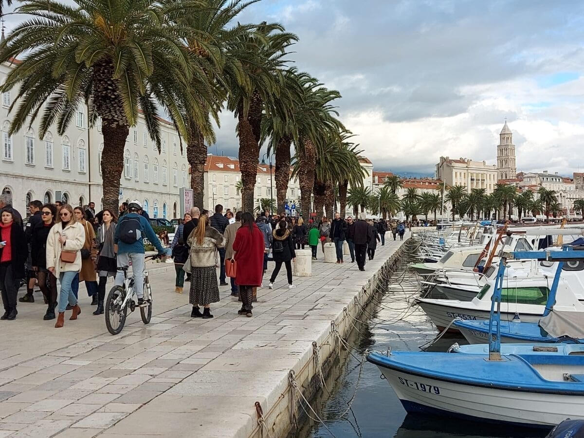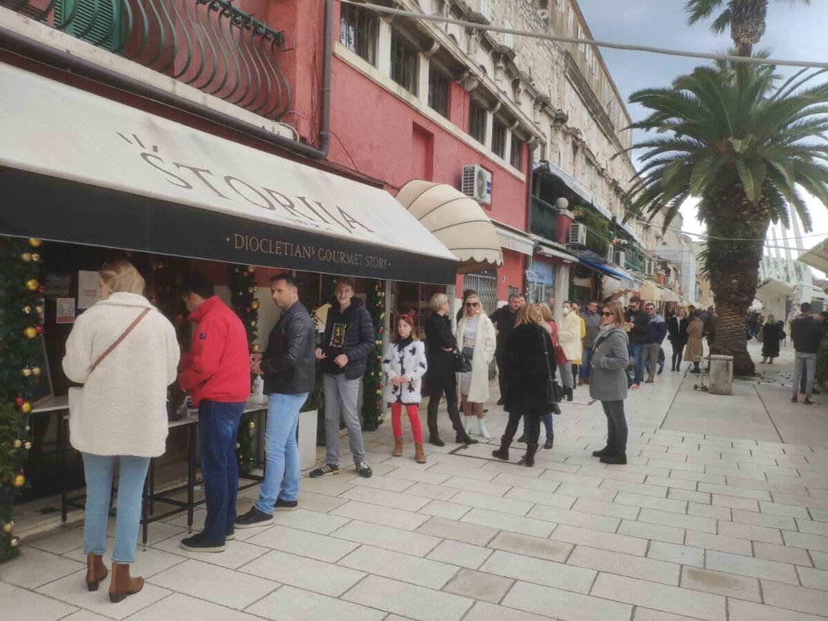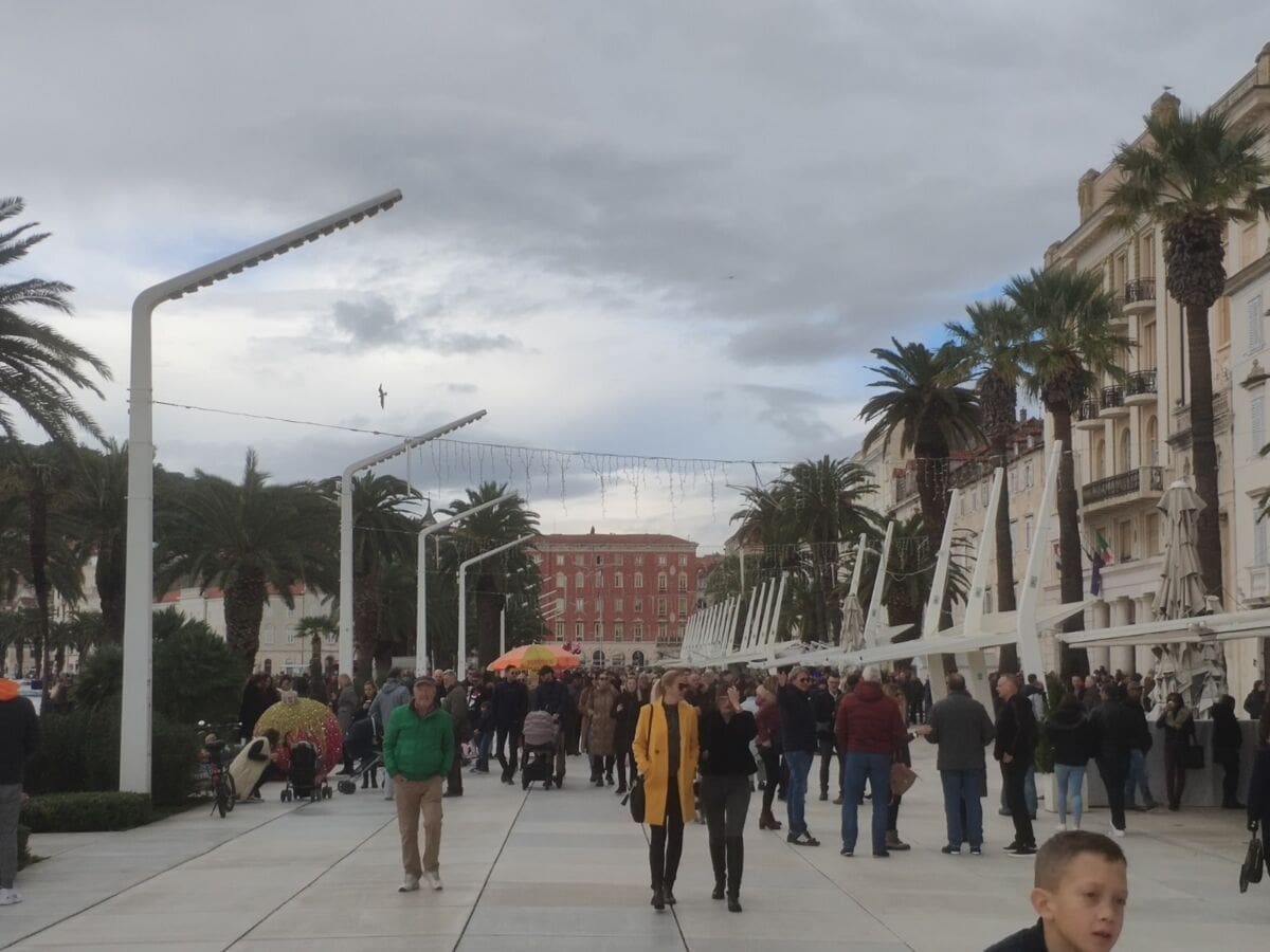 Splitska riva i danas je puna svita. Lijepo vrijeme izmamilo je ljude iz kuća, a i Stara godina je. Prijašnjih godina ovakva slika iz centra grada na Silvestrovo bila je uobičajena.
