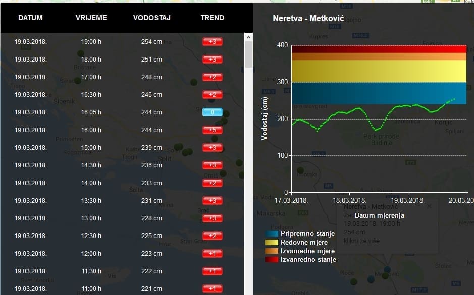 Nakon Cetine, danas se bilježi i značajniji rast Neretve. Večer je Neretva u Metkoviću dosegnula 254 cm. Zadnja 24 sata Neretva je porasla 20 centimetara. Redovne mjere zaštite od poplave ovdje se proglašavaju s 300 cm.