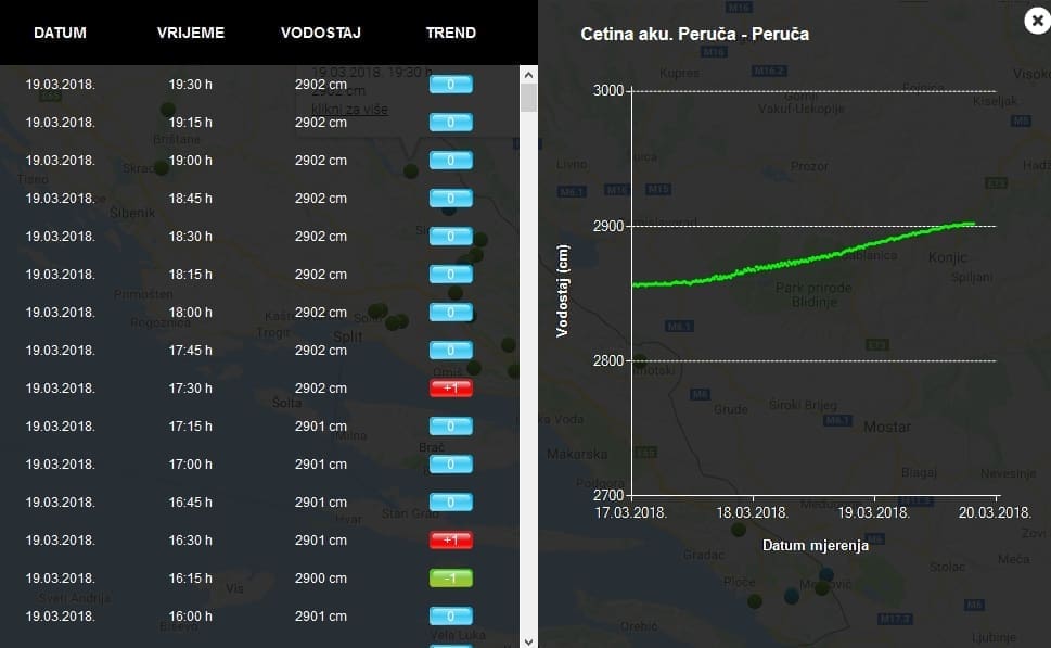 Na mjernoj postaji Han kod Sinja Cetina je dosegla razinu od 278 centimetara i još samo 2 cm nedostaju za proglašenje redovnih mjera zaštite od poplava. Vodostaj kod Trilja varira i trenutno je na 308 cm.
