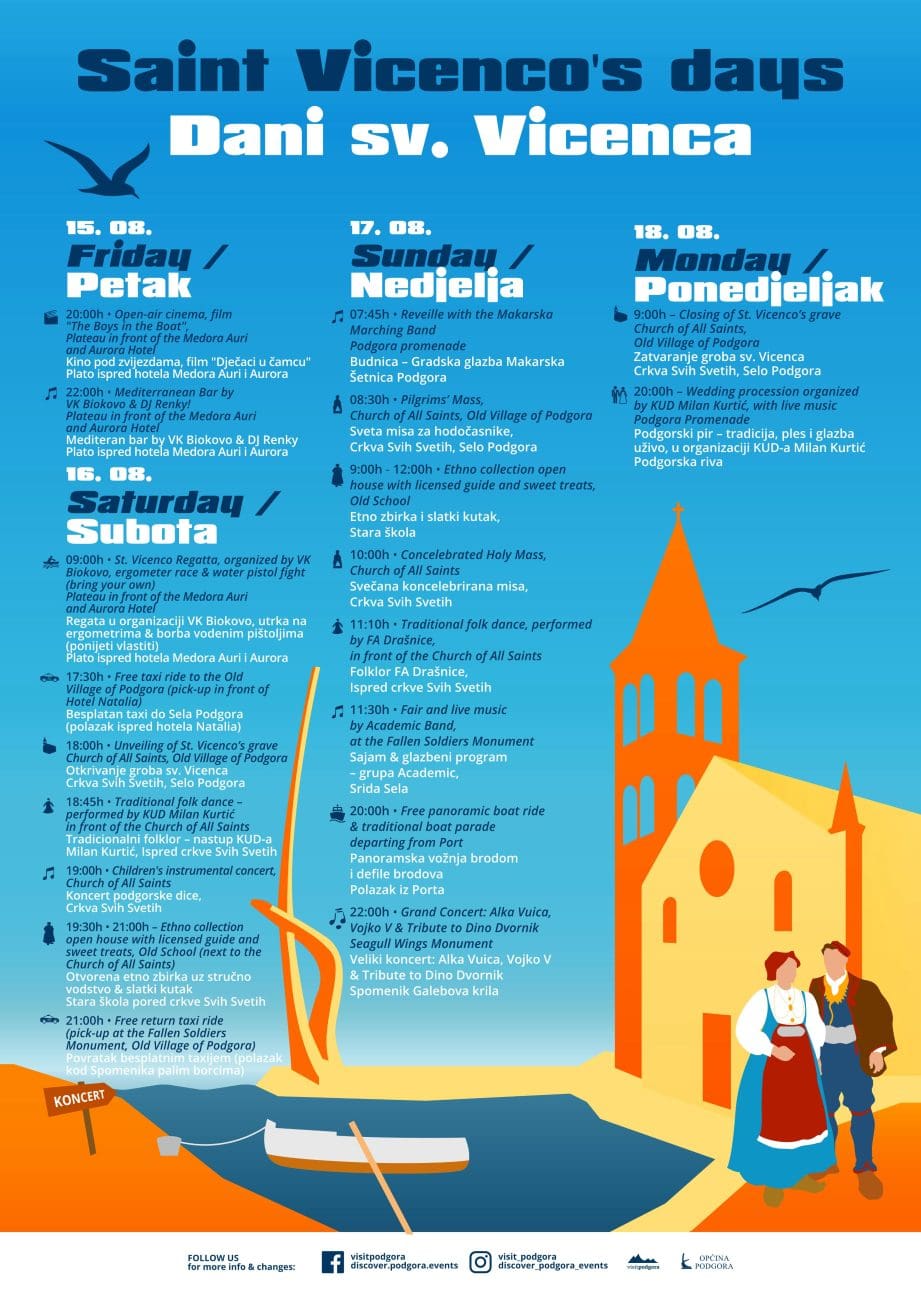 Općina Podgora i Turistička zajednica Općine Podgora pozivaju sve da im se pridruže u proslavi svetkovine, a posebno središnjeg dana – 17. kolovoza, kada se slavi dan zaštitnika sv. Vicenca.