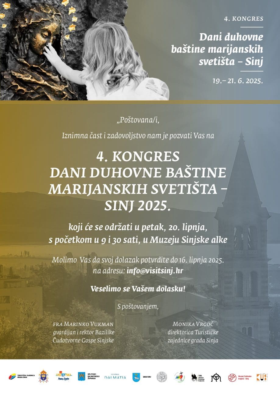 Stoga nam je čast i zadovoljstvo pozvati vas u Sinj na već tradicionalni, četvrti kongres Duhovna baština marijanskih svetišta. Kongres će se održati od 19. do 21. lipnja 2025. godine u svetištu Čudotvorne Gospe Sinjske u organizaciji Turističke zajednice Grada Sinja i Svetišta Gospe Sinjske uz potporu Splitsko-dalmatinske županije, Turističke zajednice Splitsko-dalmatinske županije, Hrvatske turističke zajednice, Grada Sinja i Viteškog alkarskog društva, te uz pomoć Muzeja Sinjske alke, Muzeja Cetinske krajine – Sinj, Kulturno umjetničkog središta Sinj i Gradske galerije Sikirica.