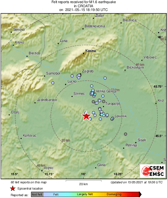 Map of felt reports received so far following the #earthquake M1.6 in Croatia 46 min ago pic.twitter.com/MOHZToj8f3