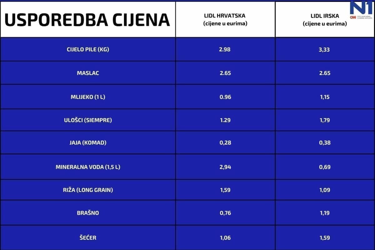 Velika je razlika i u cijenama u hrvatskom i slovenskom Lidlu, pri čemu je niz namirnica skuplje u Hrvatskoj. N1 je sada usporedio cijene devet proizvoda u irskom Lidlu s onima u Hrvatskoj. Za svaki proizvod smo u hrvatskom Lidlu uzimali najnižu moguću cijenu, a u nastavku pogledajte razlike u cijenama.