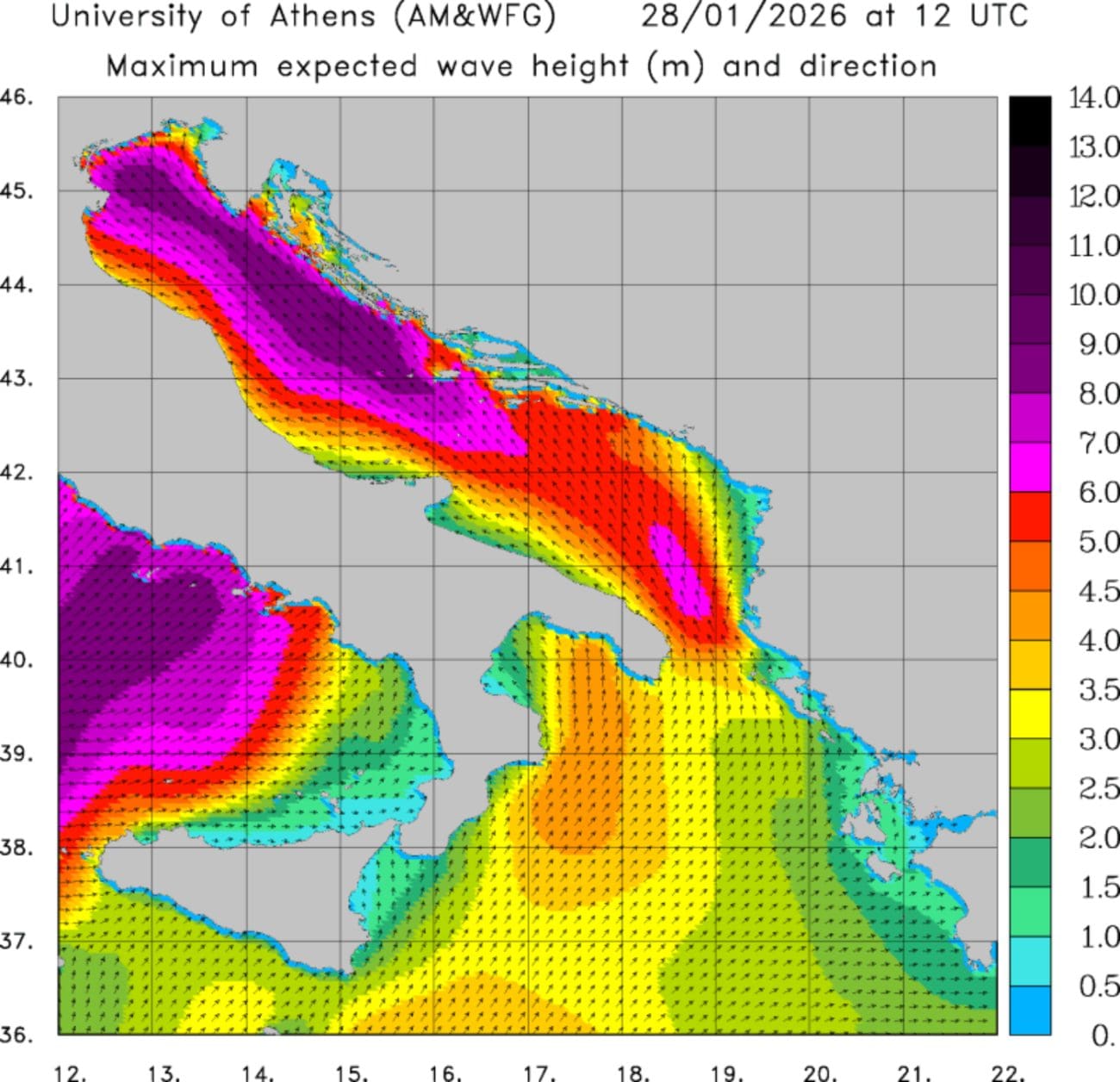 Da će ovakvo vjetrovit dan biti vezan uz valovito more, posve je jasno, a valja spomenuti da prognostički modeli prema otvorenom moru sjevernog i dijela srednjeg Jadranu predviđaju najvišu visinu valova sredinom dana i preko pet metara. Moguće je plavljenje nižih dijelova obale.