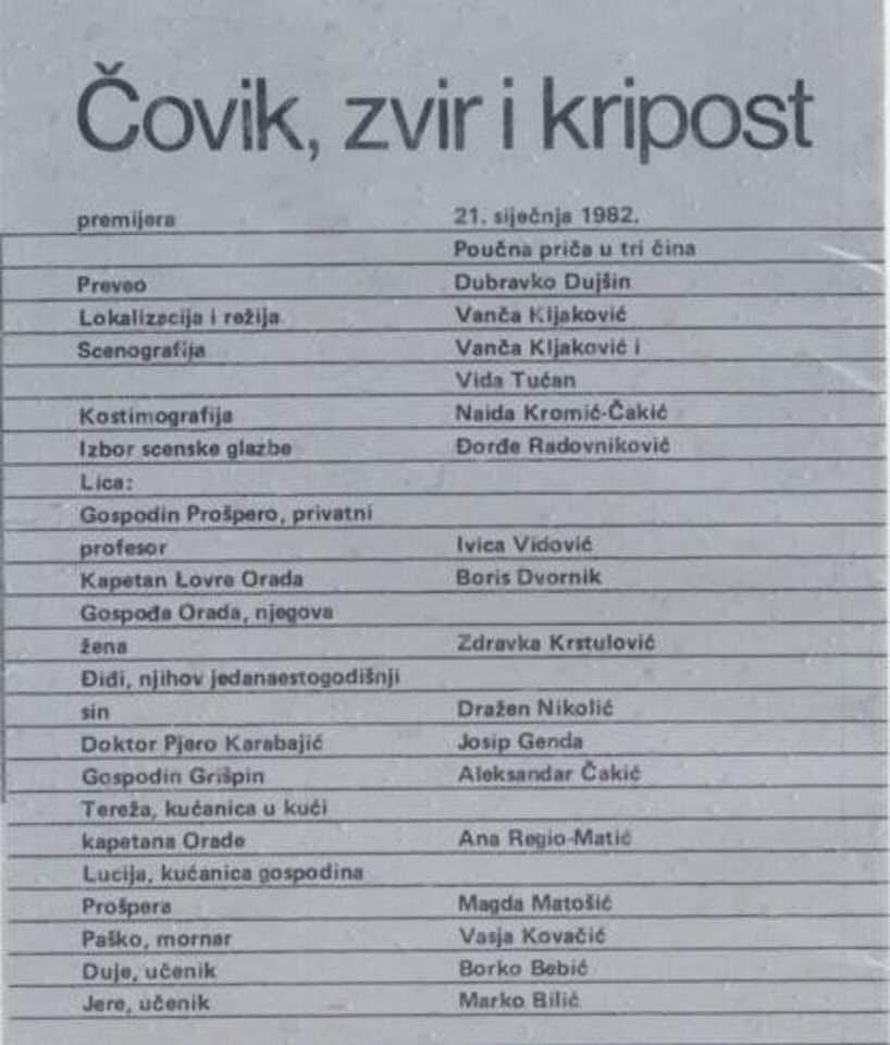 Na današnji dan prije 43 godine, premijerno je na sceni HNK Split izvedena predstava "Čovik, zvir i kripost". Komedija velikog talijanskog pisca Luigija Pirandella u lokalizaciji i režiji Vanče Kljakovića, ovaj put smještena u jedan dalmatinski gradić. Imala je dug vijek na daskama splitkog HNK-a. Naravno, tada su u njoj nastupala najveća glumačka imena tog vremena: Ivica Vidović, Boris Dvornik, Zdravka Krstulović, Josip Genda. Bilo je dovoljno da Boris kaže "Neću jist tu čikolatu..." pa da svi puknu od smijeha.
