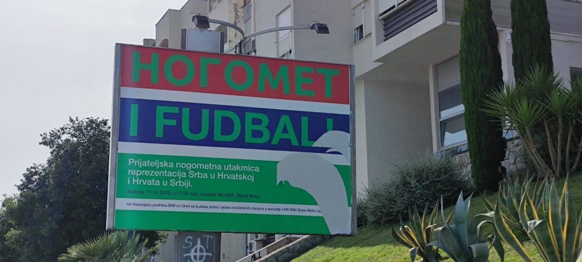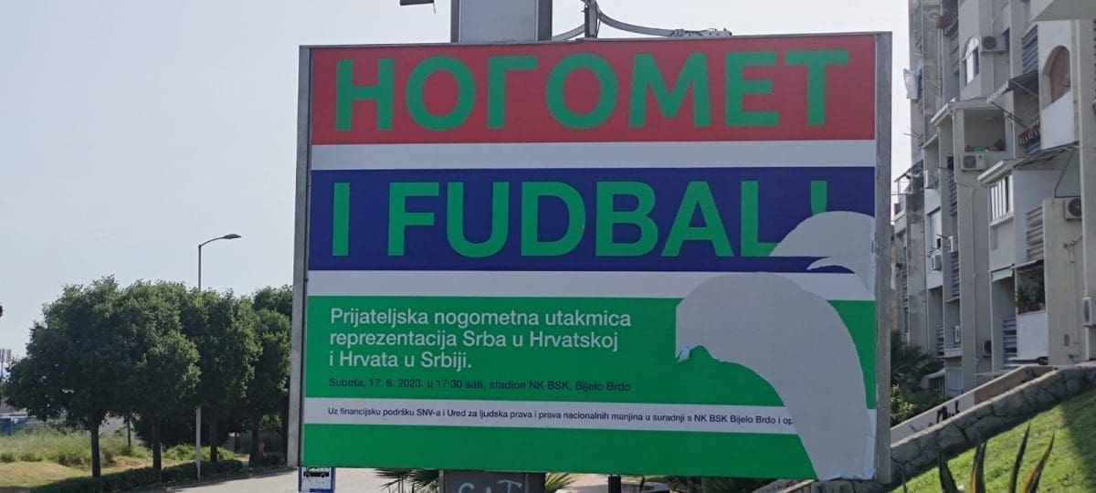 Kako se na vodi na ovom plakatu, radi se o promociji prijateljske nogometne utakmice između reprezentacija Srba u Hrvatskoj i Hrvata u Srbiji. Susret je odigran 17.6.2023. na stadionu NK BSK U Bijelom Brdu.