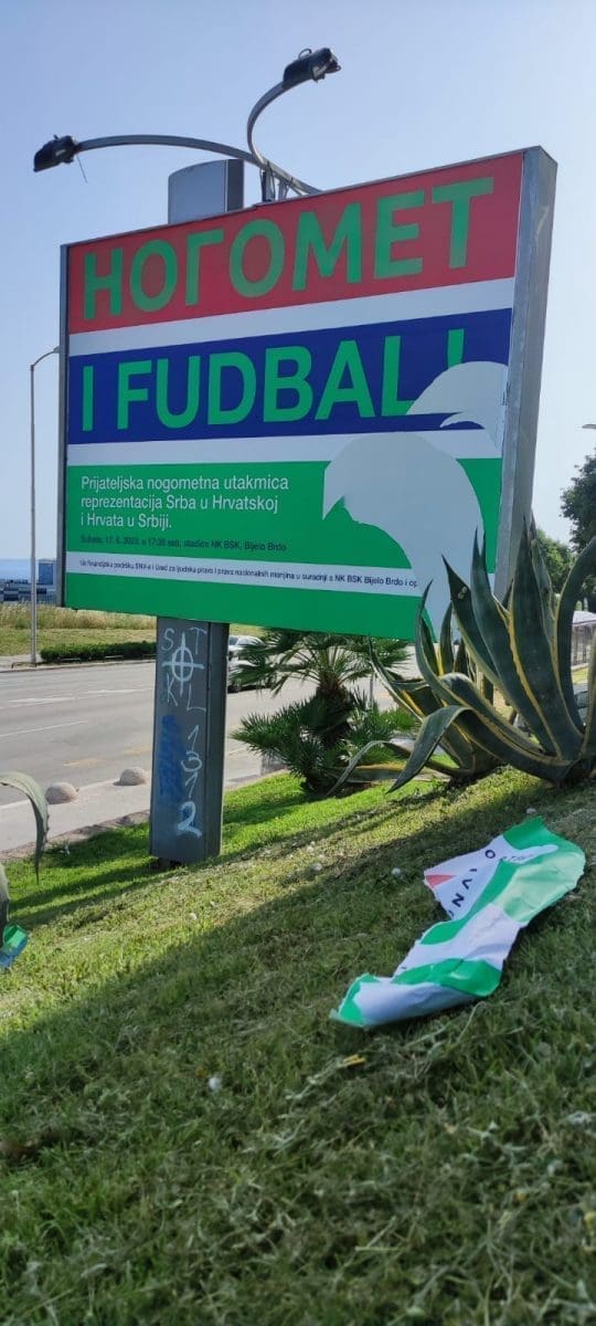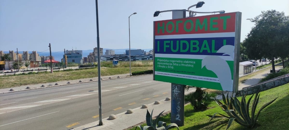 Neobičan jumbo plakat osvanuo je u Vukovarskoj ulici u Splitu, na predjelu Sućidra. Naime, latinicom je ispisano "Fudbal", a ćirilicom "Nogomet".
