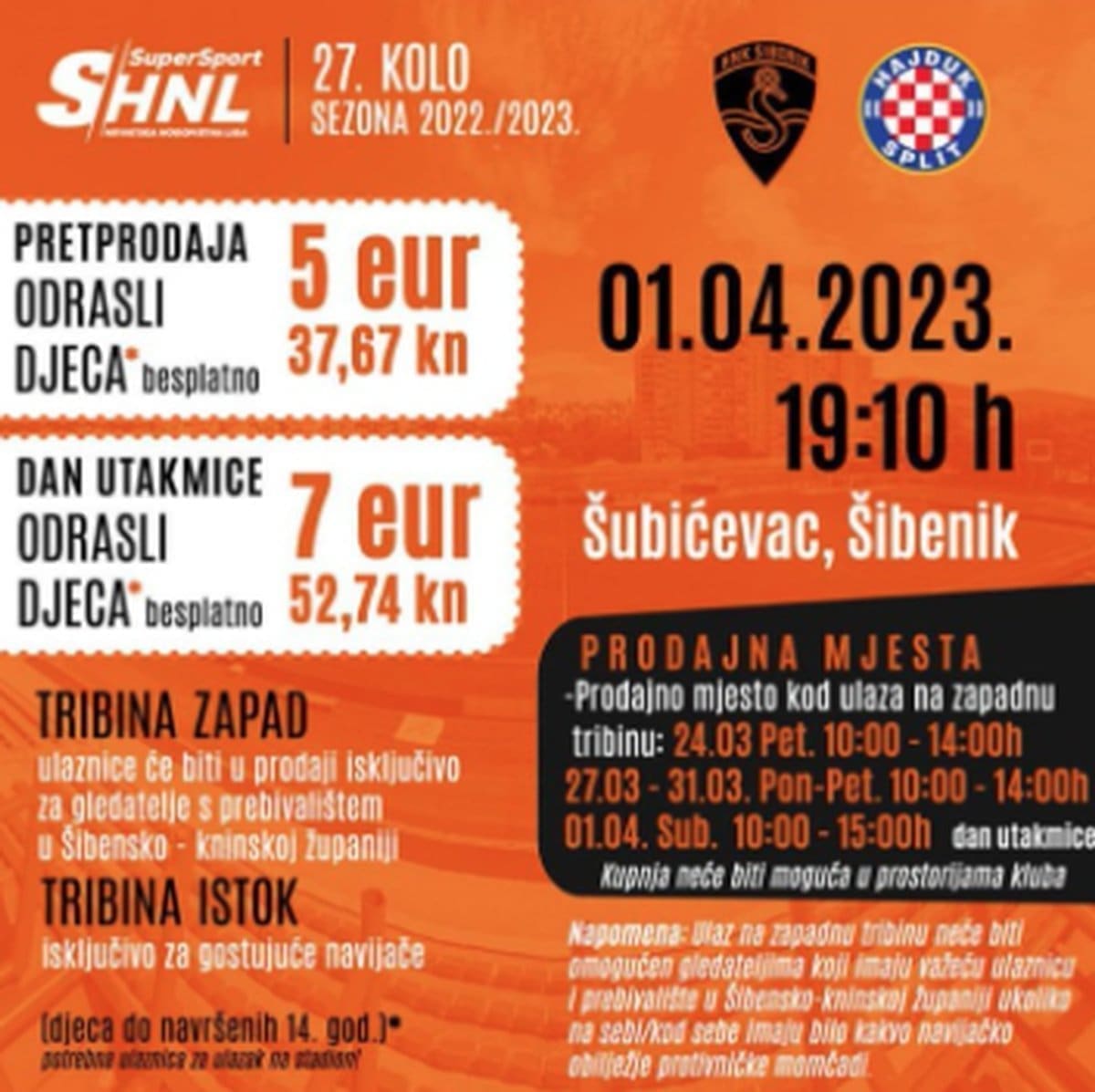 Na prethodnom su Hajdukovom gostovanju Šibenčani u prodaju pustili 638 karata za istočnu, gostujuću tribinu, a karte se mogu kupiti isključivo na stadionu podno zapadne tribine. Ovoga puta smanjili su broj i u prodaju nisu pustili puni kapacitet, ali i zabranili su kupnju karata za zapadnu, domaći tribinu ako gledatelj nema prebivalište u Šibensko-kninskoj županiji. To nije toliko upitno, ali kada se tomu nadoda činjenica da se s obilježjima gostujućeg kluba, u ovome slučaju Hajduka, ne može na zapadnu tribinu usprkos karti i prebivalištu Šibensko-kninske županije - zaključak je i više no jasan.