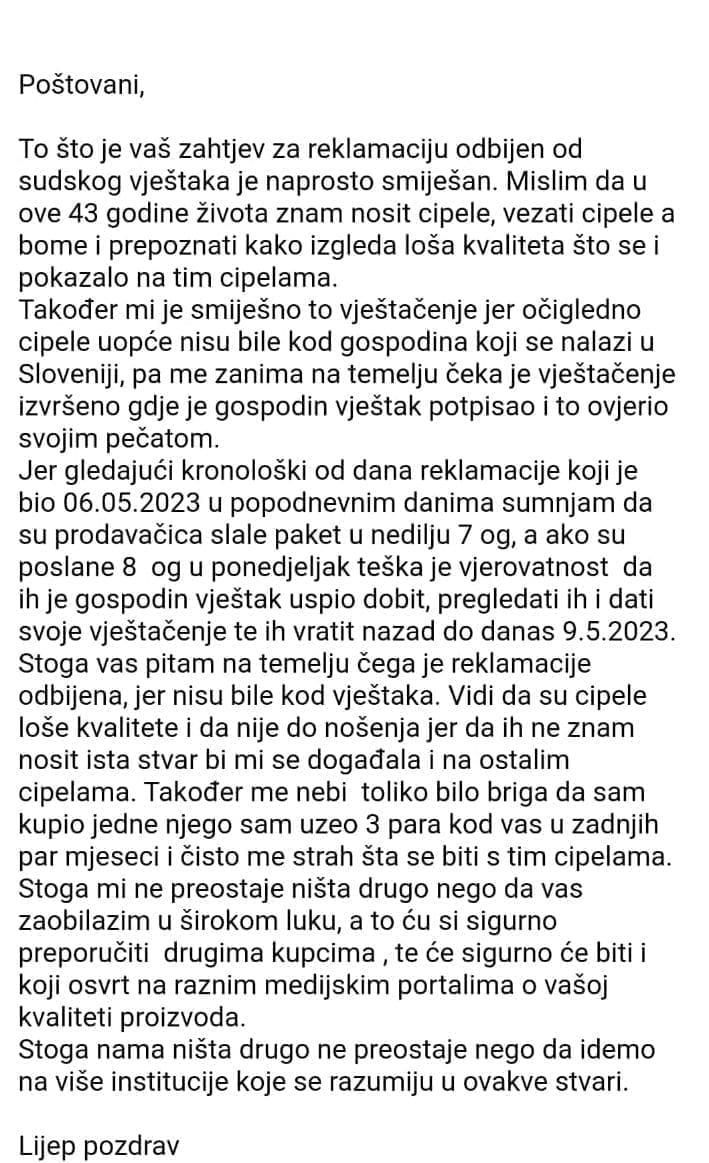 "Šestog svibnja u poslijepodnevnim satima sam reklamirao tenisice u trgovini. To je bila subota, a već 9. svibnja odnosno utorak sam zaprimio odgovor da je reklamacija odbijena nakon pregleda sudskog vještaka iz Slovenije", započinje nam čitatelj te dodaje: