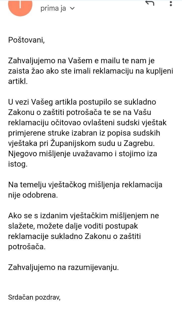 "U vezi Vašeg artikla postupilo se sukladno Zakonu u Zaštiti potrošača te se na Vašu reklamaciju očitovao ovlašteni sudski vješta primjerene struke izabran iz popisa sudskih vještaka pri Županijskom sudu u Zagrebu. Njegovo mišljenje uvažavamo i stojimo iza istog", navodi se u odgovoru trgovine.