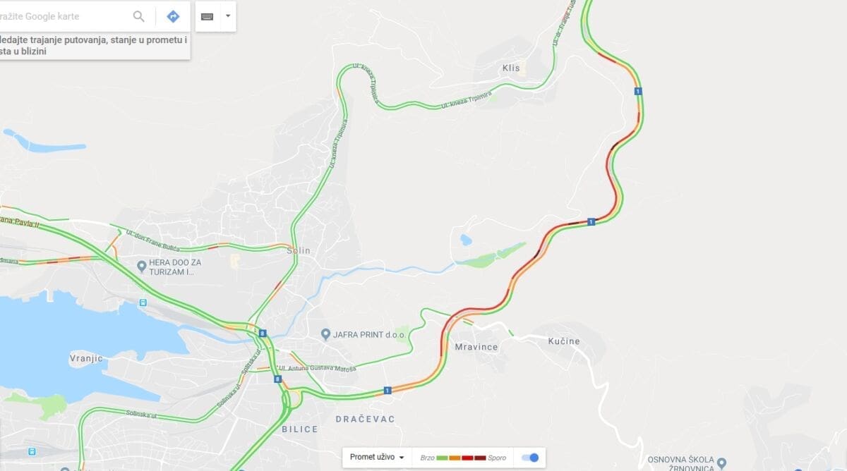 Da ovom dionicom brze ceste vladaju velike gužve potvrđuje Google traffic. Jedva pokretna kolona počinje kod Klis - Grla, a završava kod Dračevca.