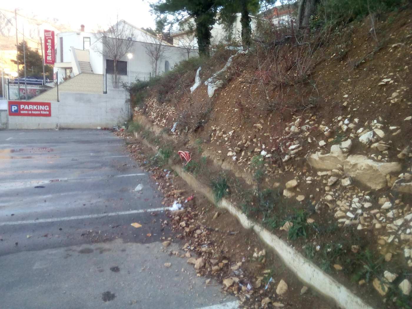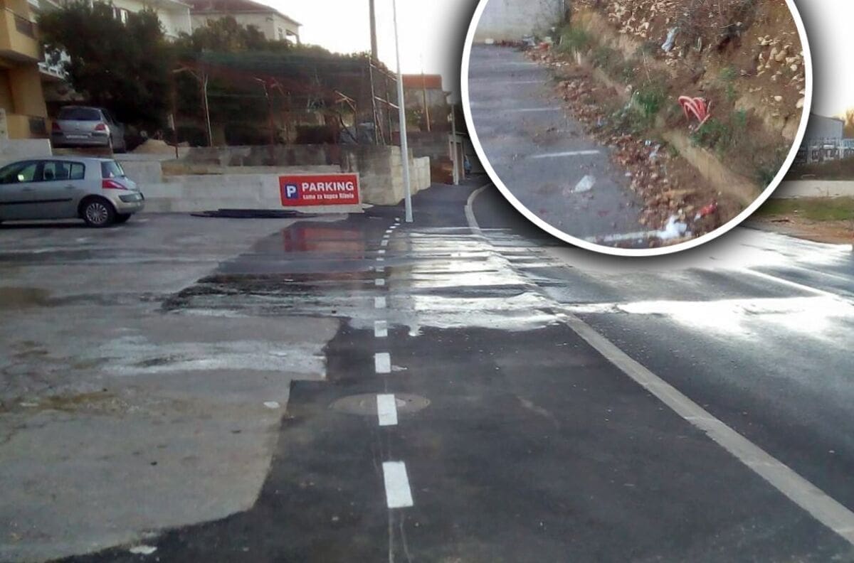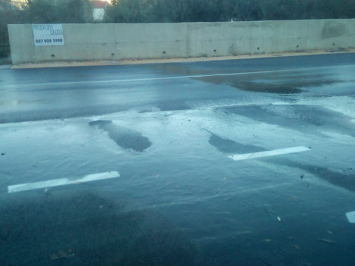 Prethodne noći došlo je do prelijevanja vode preko nedavno rekonstruirane ceste između Strožanca i Žrnovnice i to točno na području prije nekoliko mjeseci proširenog parkirališta trgovine Ribola.