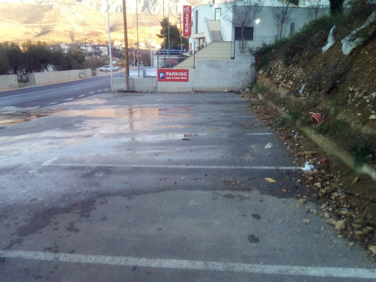 Kako su nam javili brojni čitatelji, voda se preko parkirališta i nogostupa prelijeva na cestu gdje otječe na suprotnu stranu. Problem je tim izraženiji jer je noćas ovdje bilo ispod nule pa su se i na kolniku i na nogostupu povremeno stvarale zaleđene površine koje su predstavljale opasnost za pješake i vozače.
