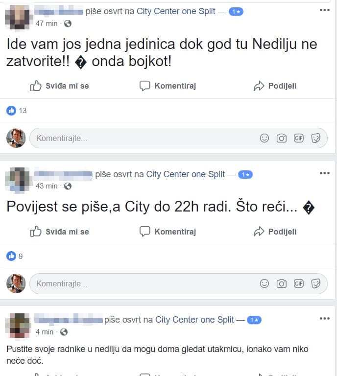 Neke trgovine su ponovno najavile ranije zatvaranje, ali neke su ostale na starom radnom vremenu. Tako je i City Center One u Splitu na sebe privukao velik broj kritika jer u nedjelju radi do 22 sata. Ogorčeni korisnici društvenih mreža odmah su požurili na Facebook stranicu trgovine i podijelili im 'jedinice'. Hoće li njihova akcija uroditi plodom, ostaje za vidjeti...