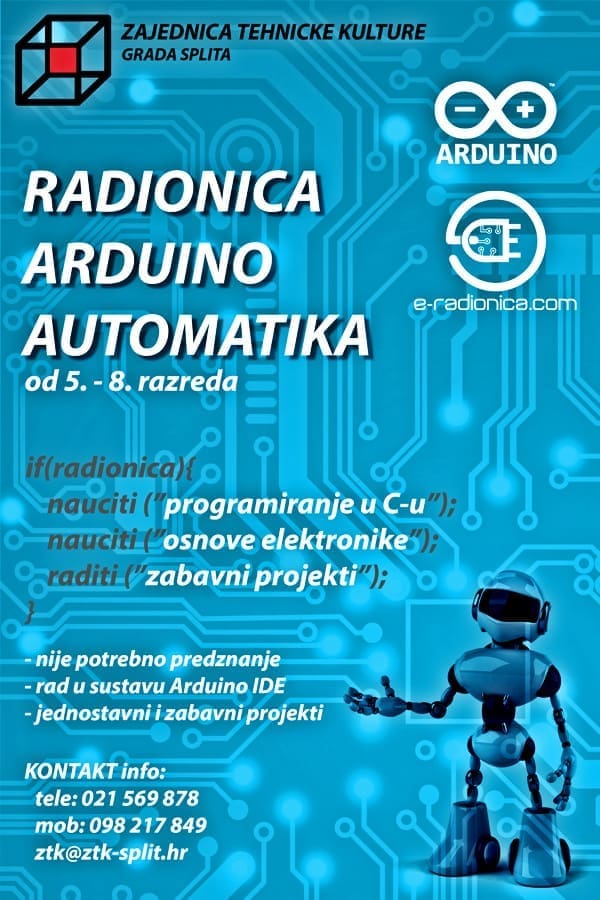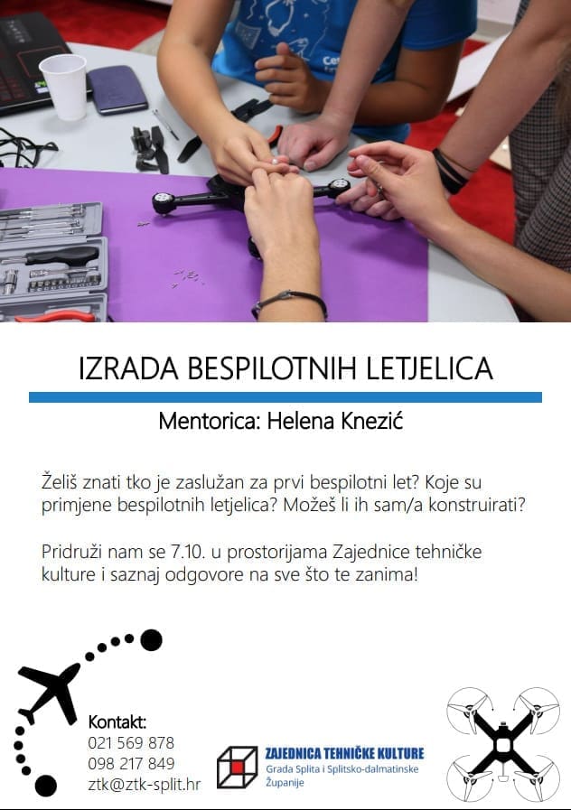 Početkom nove školske godine 2019./2020. pored već započete provedbe programa radionica robotike i modelarstva, Zajednica tehničke kulture grada Splita za učenike osnovnih škola organizira izvannastavne i izvanškolske radionice Arduino automatike, te radionice o bespilotnim letjelicama („dronovima“). Oba ta programa su namijenjena učenicima 5.-8. razreda osnovne škole. Radionice započinju s radom 7. listopada.