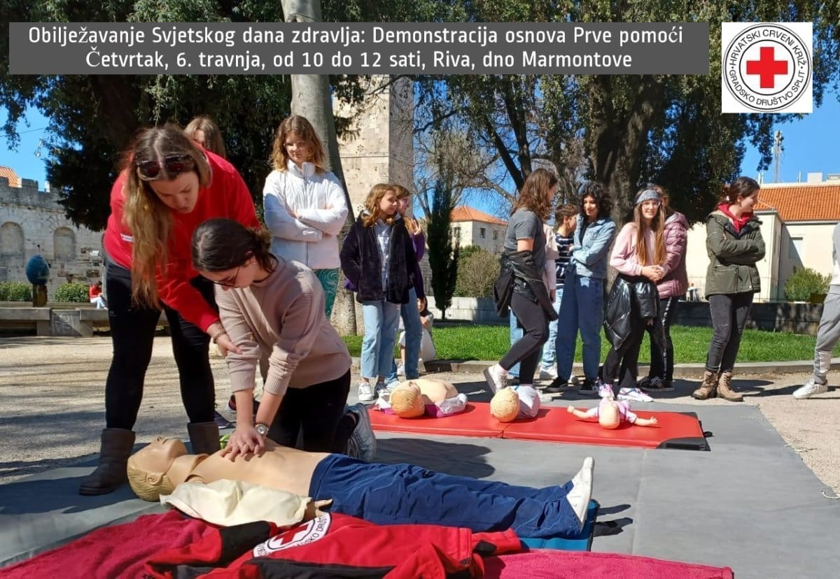 Svjetski dan zdravlja tradicionalno se obilježava u travnju, a Crveni križ Split ove će godine tim povodom na splitskoj Rivi upriličiti prigodno obilježavanje 6. travnja od 10 do 12 sati. U tom će vremenu na zapadnom dijelu rive ispod Marmontove ulice biti postavljen baldahin Crvenog križa, strunjače i lutke na kojima će biti demonstrirane osnove Prve pomoći.