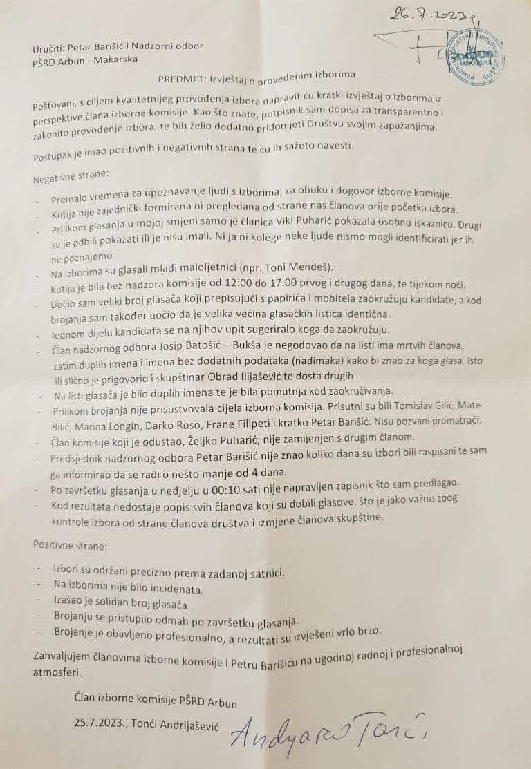 Kako smo u samom uvodu spomenuli, čak 19 članova PŠRD Arbuna osvrće na 21. i 22. srpnja održane izbore za zastupnike u skupštini PŠRD „Arbun“. Tvrde kako su izbori provedeni protuzakonito te su Nadzornom odboru društva uputili prijavu nepravilnosti, a njihov dopis u kojemu navode sporne elemente izbora, zajedno s foto materijalom kojeg su nam poslali, objavljujemo u cijelosti.