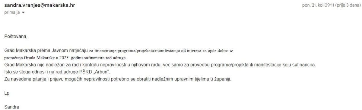 Lp, Sandra Vranješ", stoji u potpisu odgovora iz Grada Makarske.