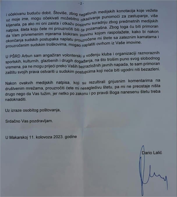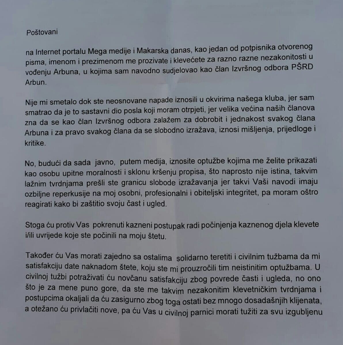 Priča se nastavlja dalje tako da je jedan od članova Uprave, zamjenik predsjednika Kluba, Dario Lalić, po struci odvjetnik, svakom pojedinačno na kućnu adresu poslao dopis da će ih tužiti, blokirati im imovinu, poduzeti vrlo neugodne radnje, a sve zbog toga što su ga se usudili spomenuti imenom i prezimenomu javnosti. Portal Mega media Lalićevo pismo prenio je u cijelosti, a kako im je rekao jedan od članova PŠRD 'Arbun' ovo pismo smatra pokušajem zastrašivanja, pa čak i prijetnjom. Dodaje kako će zbog pisma kojeg je dobio angažirati odvjetnika, a o svemu će izvijestiti i Hrvatsku odvjetničku komoru jer drži da je postupak odvjetnika Daria Lalića u najmanju ruku kontroverzan.