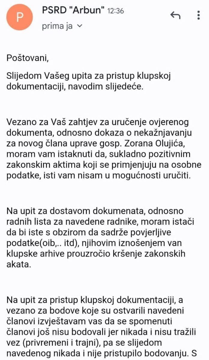 Odgovor smo dobili od PŠRD Arbun istoga dana kada je upit i poslan.