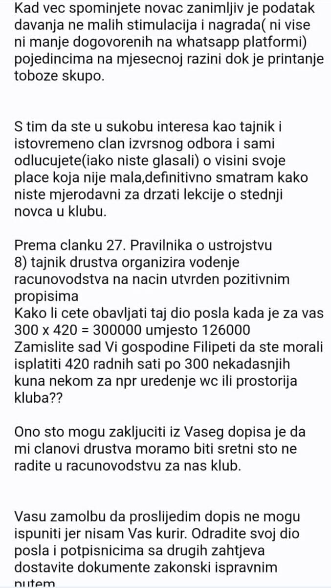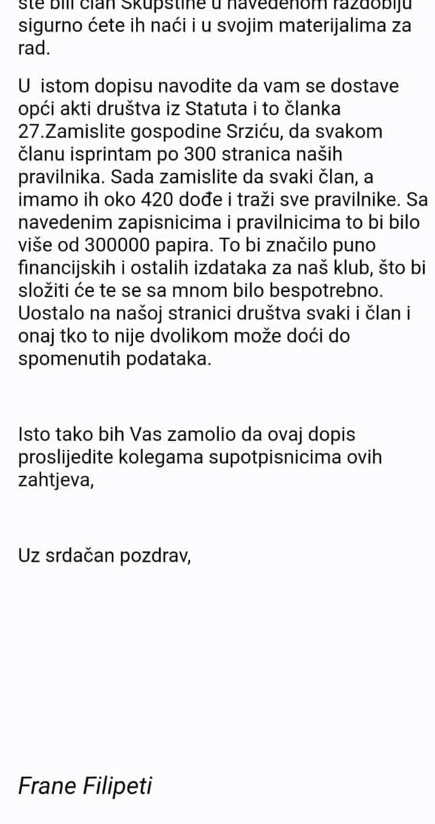 Bilo je tu brojnih drugih nepravilnosti. Na brzinu smo reagirali, prijavili smo da su na popisu preminuli članovi koje znamo pola stoljeća, al je tajnik izjavio da su im to potomci, odnosno druge osobe s istim imenom i prezimenom. Zatražili smo pismenim putem zakonski valjan popis članova koji navodi sve potrebne kategorije da vidimo jel' to istina, ali nam je tajnik Frane Filipeti odbio i još uvijek odbija dati te podatke. A prošlo je više od mjesec dana od izbora", uvodi nas pomalo u priču Emil Dešković, član Kluba i potpisnik dopisa, koji je zamalo izbačen iz Kluba upravo zato što je digao glas putem klupskih tijela.